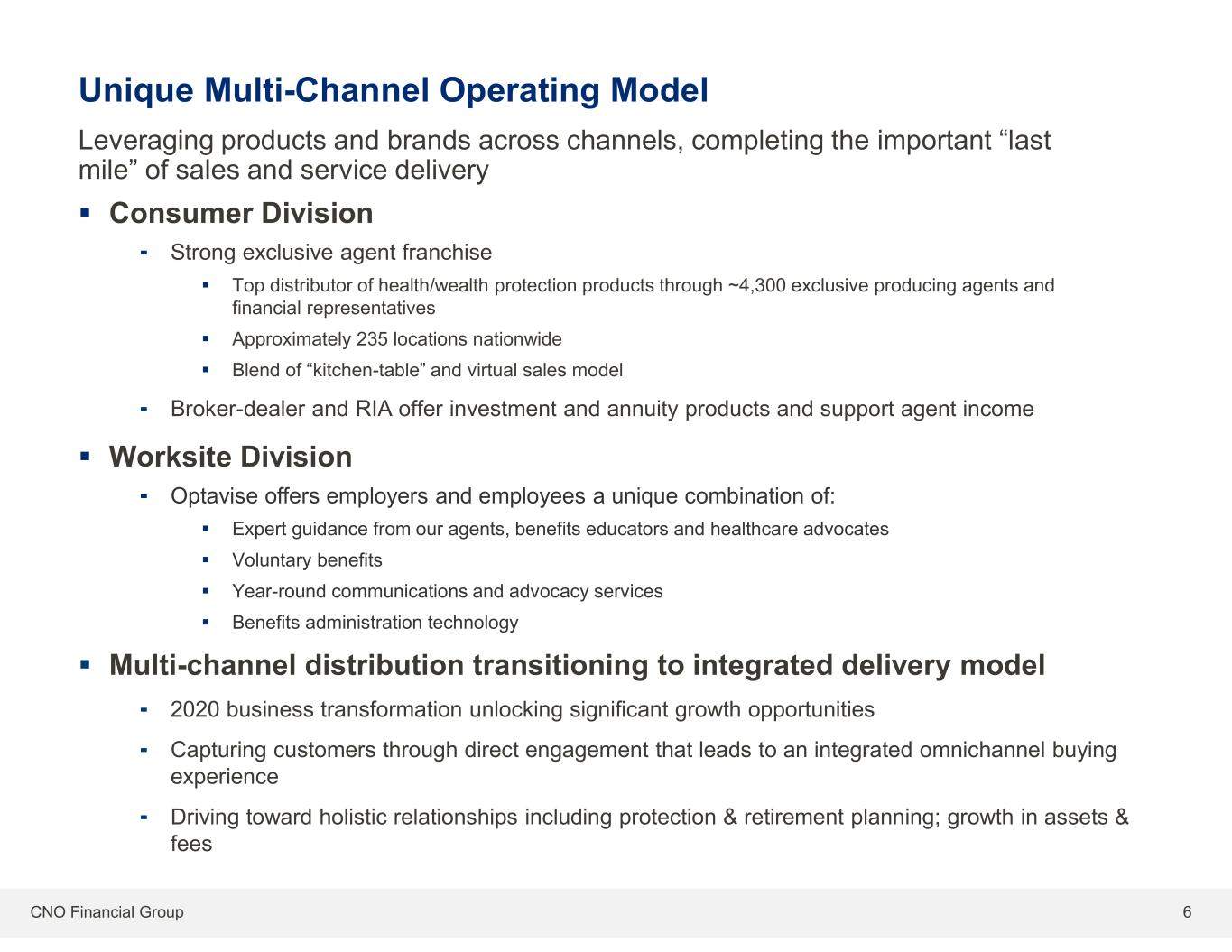 CNO Financial Group 5 ~45% of middle-income households have no life insurance1; ~55% of baby boomers lack financial advisors2 Well-Positioned in the Attractive Senior Middle Market  Extensive experience and understanding of the middle market  Differentiated with our market vs. product focus  Diversification of products and distribution provides sustainable competitive advantage  Positioned to help customers to address main concerns of outliving their assets and dealing with rising healthcare costs as they age Percentage of Population Age 65+ without a Financial Product3,4 CNO Solutions 38% 71% 73% 75% Med Supplement or Med Advantage LTC 401(k), 403(b), or other employer-sponsored retirement account Annuities 1 LIMRA 2021 Barometer Study 2 2021 Forrester Analytics Technographics 3 LIMRA 2021 Consumer Perspective on Long Term Care and Insurance; includes all age ranges, not just 65+ 4 Medicare Market Competition, Mark Farrah 2020, Year Over Year Medicare Supplement Market Snapshot and Plan Performance Insight, Mark Farrah 2021; includes people who are eligible for Medicare due to disability, not just 65+
