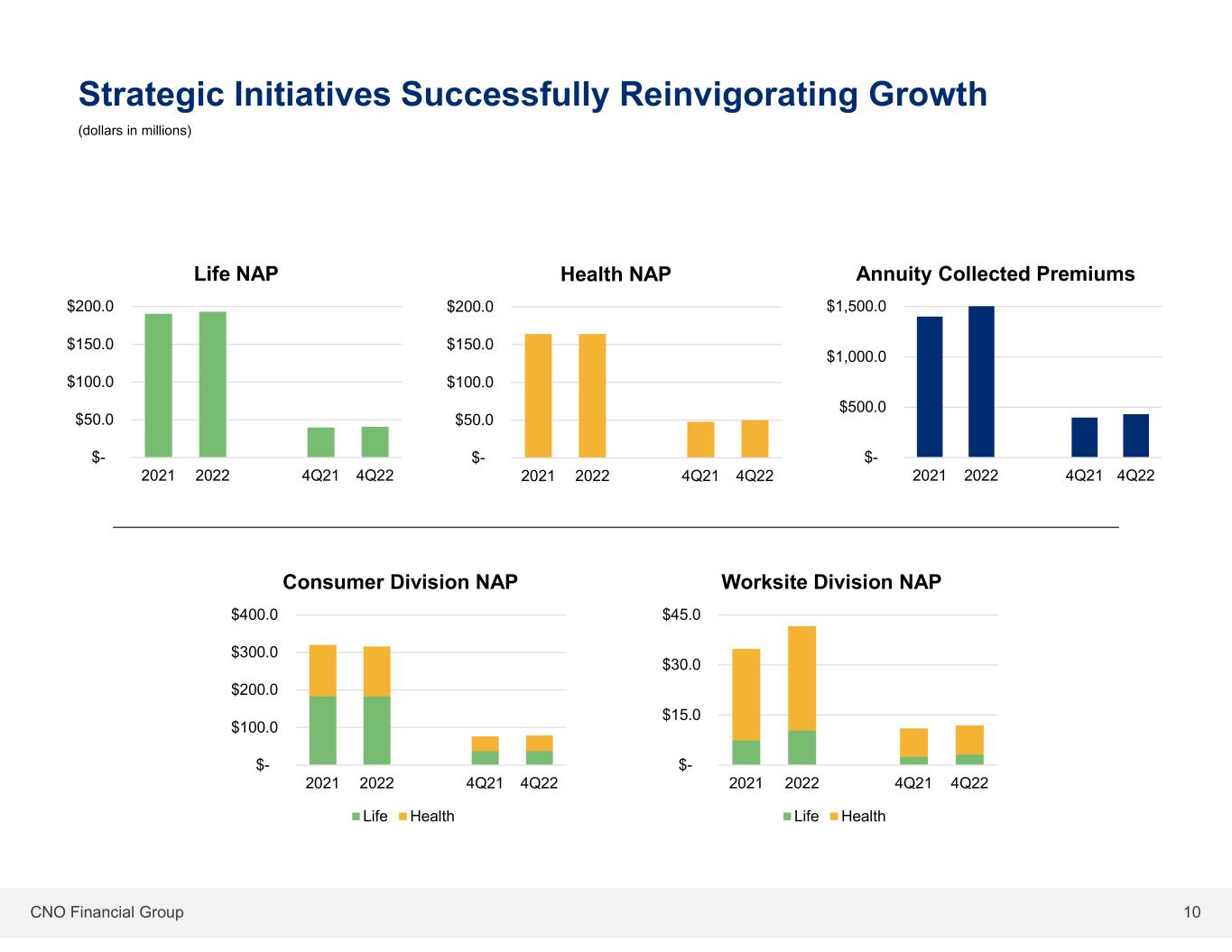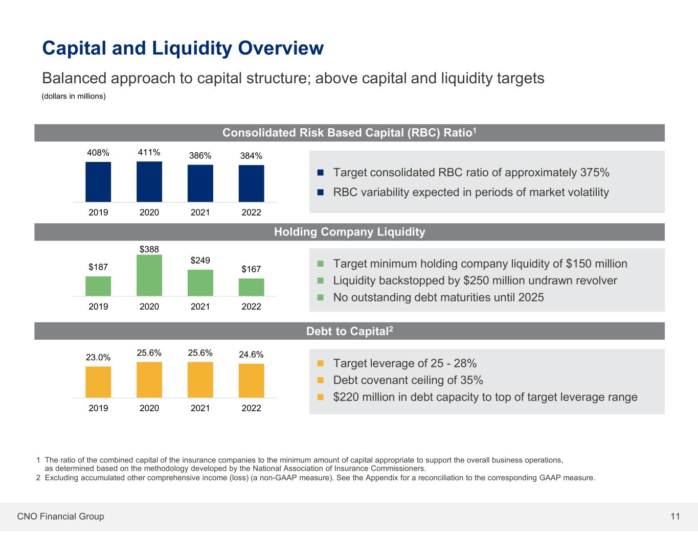 CNO Financial Group 10 Strategic Initiatives Successfully Reinvigorating Growth (dollars in millions) $- $50.0 $100.0 $150.0 $200.0 2021 2022 4Q21 4Q22 Life NAP $- $50.0 $100.0 $150.0 $200.0 2021 2022 4Q21 4Q22 Health NAP $- $500.0 $1,000.0 $1,500.0 2021 2022 4Q21 4Q22 Annuity Collected Premiums $- $100.0 $200.0 $300.0 $400.0 2021 2022 4Q21 4Q22 Consumer Division NAP Life Health $- $15.0 $30.0 $45.0 2021 2022 4Q21 4Q22 Worksite Division NAP Life Health