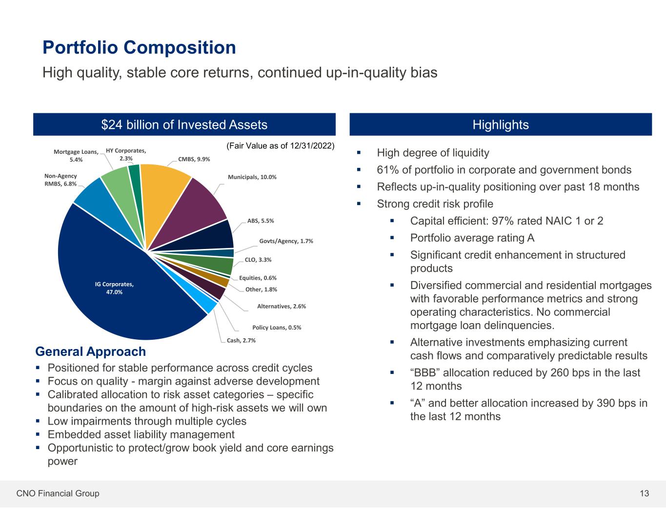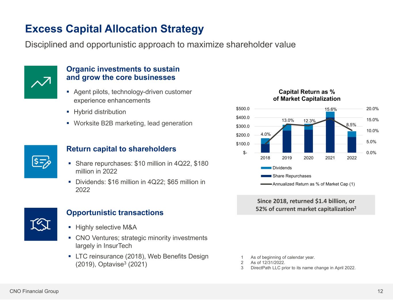 CNO Financial Group 12  Agent pilots, technology-driven customer experience enhancements  Hybrid distribution  Worksite B2B marketing, lead generation  Share repurchases: $10 million in 4Q22, $180 million in 2022  Dividends: $16 million in 4Q22; $65 million in 2022 Return capital to shareholders Organic investments to sustain and grow the core businesses Disciplined and opportunistic approach to maximize shareholder value Excess Capital Allocation Strategy 4.0% 13.0% 12.3% 15.6% 8.5% 0.0% 5.0% 10.0% 15.0% 20.0% $- $100.0 $200.0 $300.0 $400.0 $500.0 2018 2019 2020 2021 2022 Capital Return as % of Market Capitalization Dividends Share Repurchases Annualized Return as % of Market Cap (1)  Highly selective M&A  CNO Ventures; strategic minority investments largely in InsurTech  LTC reinsurance (2018), Web Benefits Design (2019), Optavise3 (2021) Opportunistic transactions Since 2018, returned $1.4 billion, or 52% of current market capitalization2 1 As of beginning of calendar year. 2 As of 12/31/2022. 3 DirectPath LLC prior to its name change in April 2022.