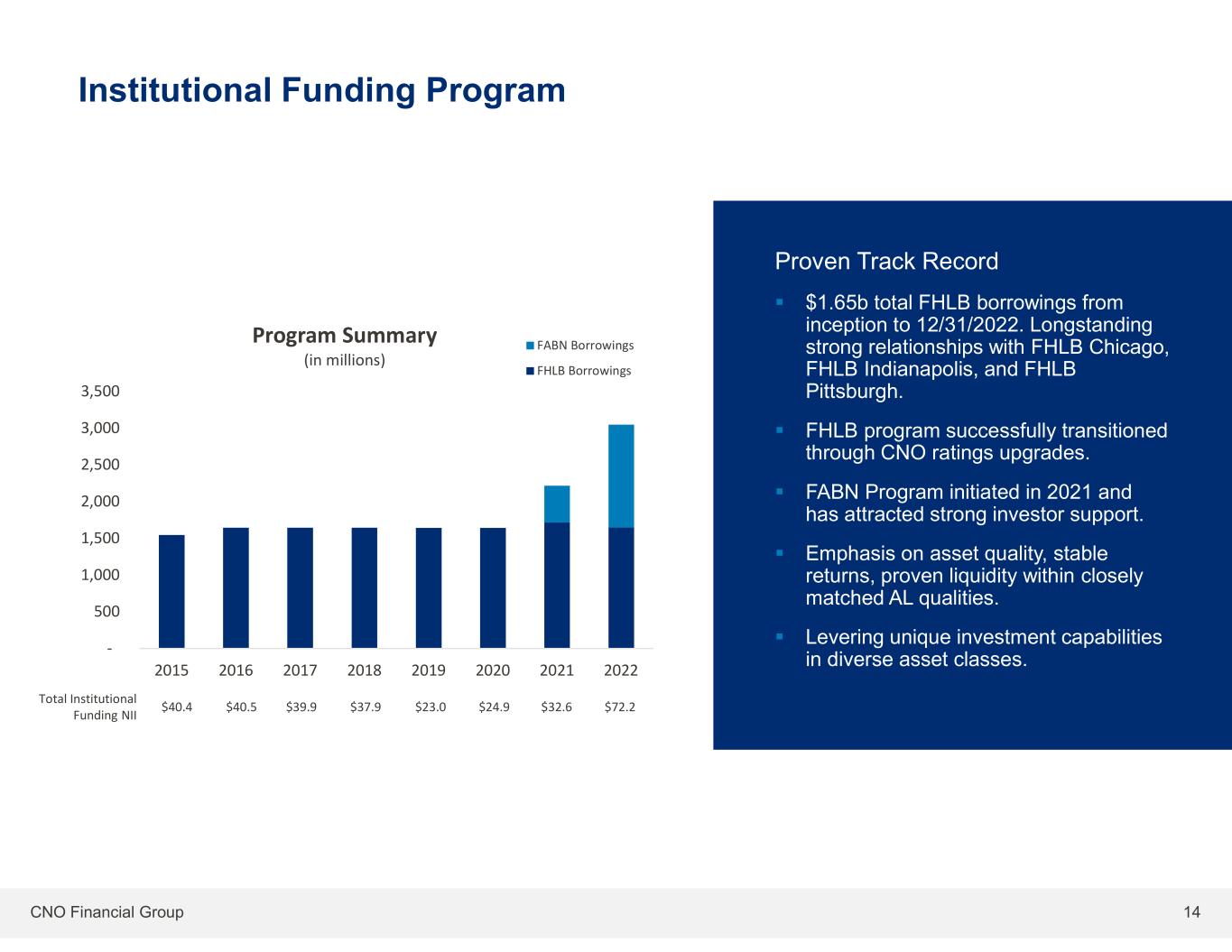 CNO Financial Group 13 High quality, stable core returns, continued up-in-quality bias Portfolio Composition $24 billion of Invested Assets Highlights (Fair Value as of 12/31/2022) General Approach  Positioned for stable performance across credit cycles  Focus on quality - margin against adverse development  Calibrated allocation to risk asset categories – specific boundaries on the amount of high-risk assets we will own  Low impairments through multiple cycles  Embedded asset liability management  Opportunistic to protect/grow book yield and core earnings power  High degree of liquidity  61% of portfolio in corporate and government bonds  Reflects up-in-quality positioning over past 18 months  Strong credit risk profile  Capital efficient: 97% rated NAIC 1 or 2  Portfolio average rating A  Significant credit enhancement in structured products  Diversified commercial and residential mortgages with favorable performance metrics and strong operating characteristics. No commercial mortgage loan delinquencies.  Alternative investments emphasizing current cash flows and comparatively predictable results  “BBB” allocation reduced by 260 bps in the last 12 months  “A” and better allocation increased by 390 bps in the last 12 months IG Corporates, 47.0% Non-Agency RMBS, 6.8% Mortgage Loans, 5.4% HY Corporates, 2.3% CMBS, 9.9% Municipals, 10.0% ABS, 5.5% Govts/Agency, 1.7% CLO, 3.3% Equities, 0.6% Other, 1.8% Alternatives, 2.6% Policy Loans, 0.5% Cash, 2.7%