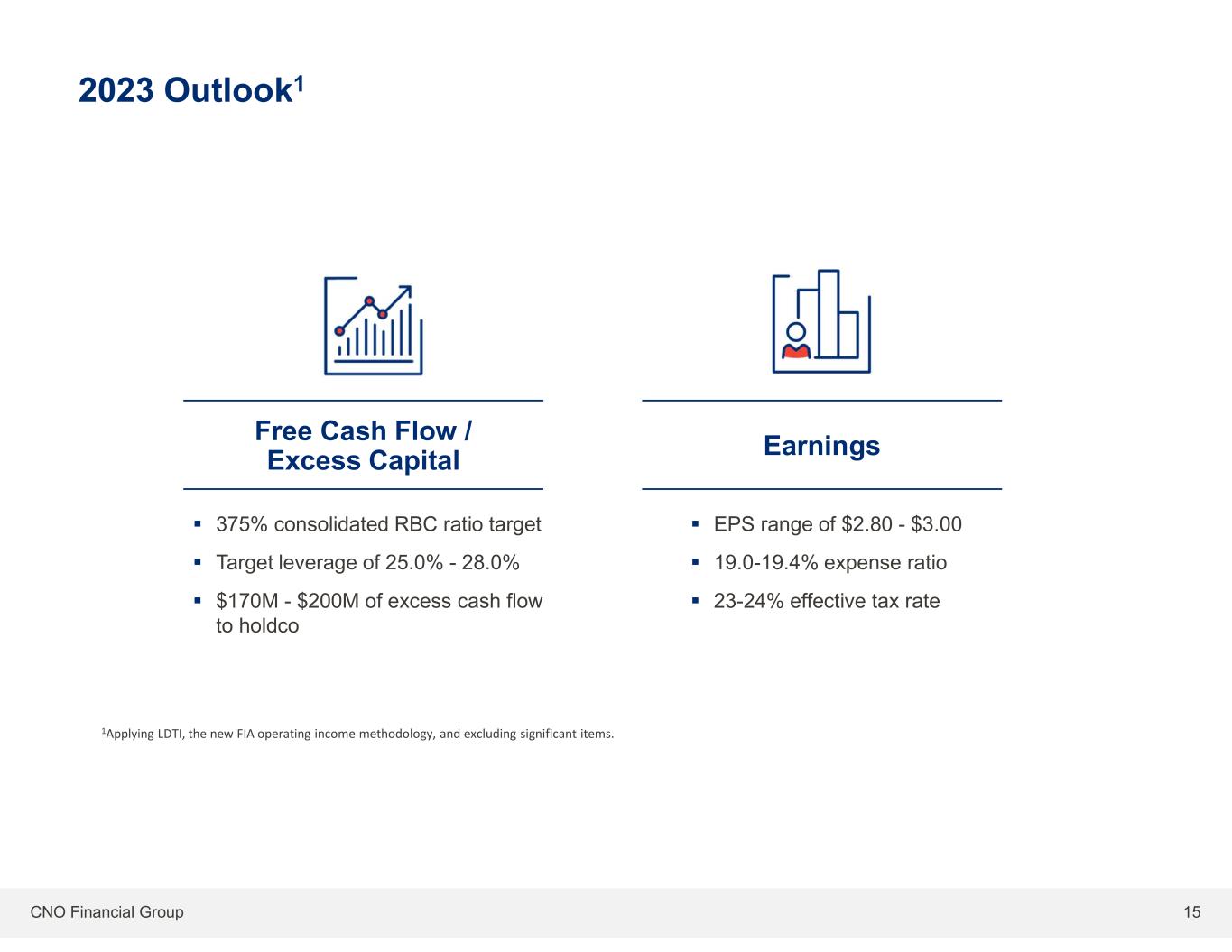 CNO Financial Group 14 Institutional Funding Program Proven Track Record  $1.65b total FHLB borrowings from inception to 12/31/2022. Longstanding strong relationships with FHLB Chicago, FHLB Indianapolis, and FHLB Pittsburgh.  FHLB program successfully transitioned through CNO ratings upgrades.  FABN Program initiated in 2021 and has attracted strong investor support.  Emphasis on asset quality, stable returns, proven liquidity within closely matched AL qualities.  Levering unique investment capabilities in diverse asset classes. - 500 1,000 1,500 2,000 2,500 3,000 3,500 2015 2016 2017 2018 2019 2020 2021 2022 Program Summary (in millions) FABN Borrowings FHLB Borrowings Total Institutional Funding NII $40.4 $40.5 $39.9 $37.9 $23.0 $24.9 $32.6 $72.2