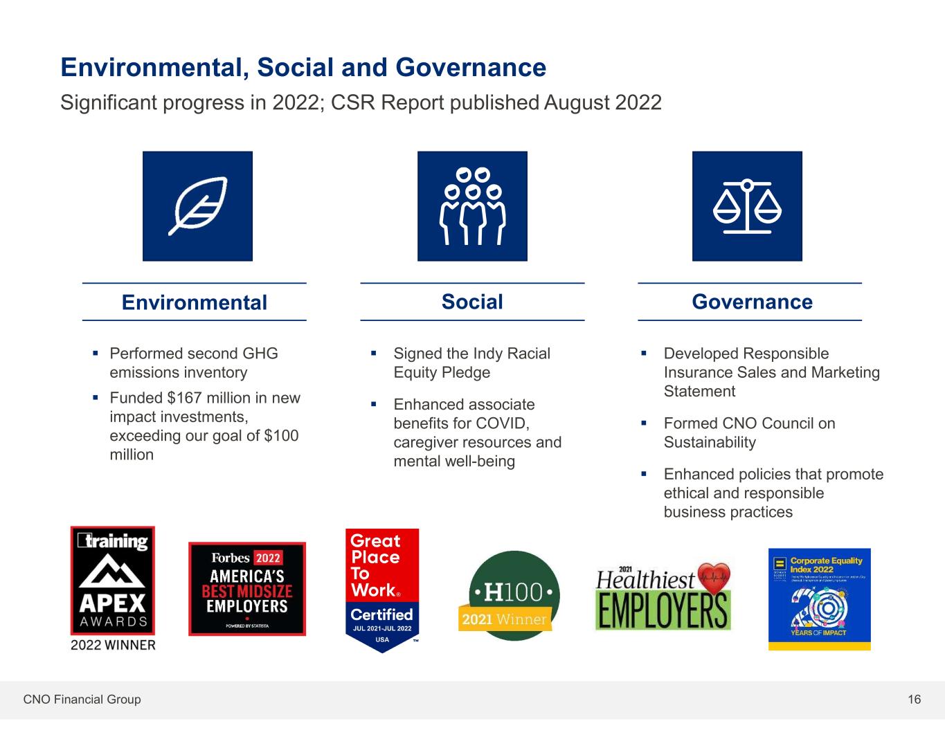 CNO Financial Group 15 2023 Outlook1 1Applying LDTI, the new FIA operating income methodology, and excluding significant items. Free Cash Flow / Excess Capital Earnings  375% consolidated RBC ratio target  Target leverage of 25.0% - 28.0%  $170M - $200M of excess cash flow to holdco  EPS range of $2.80 - $3.00  19.0-19.4% expense ratio  23-24% effective tax rate
