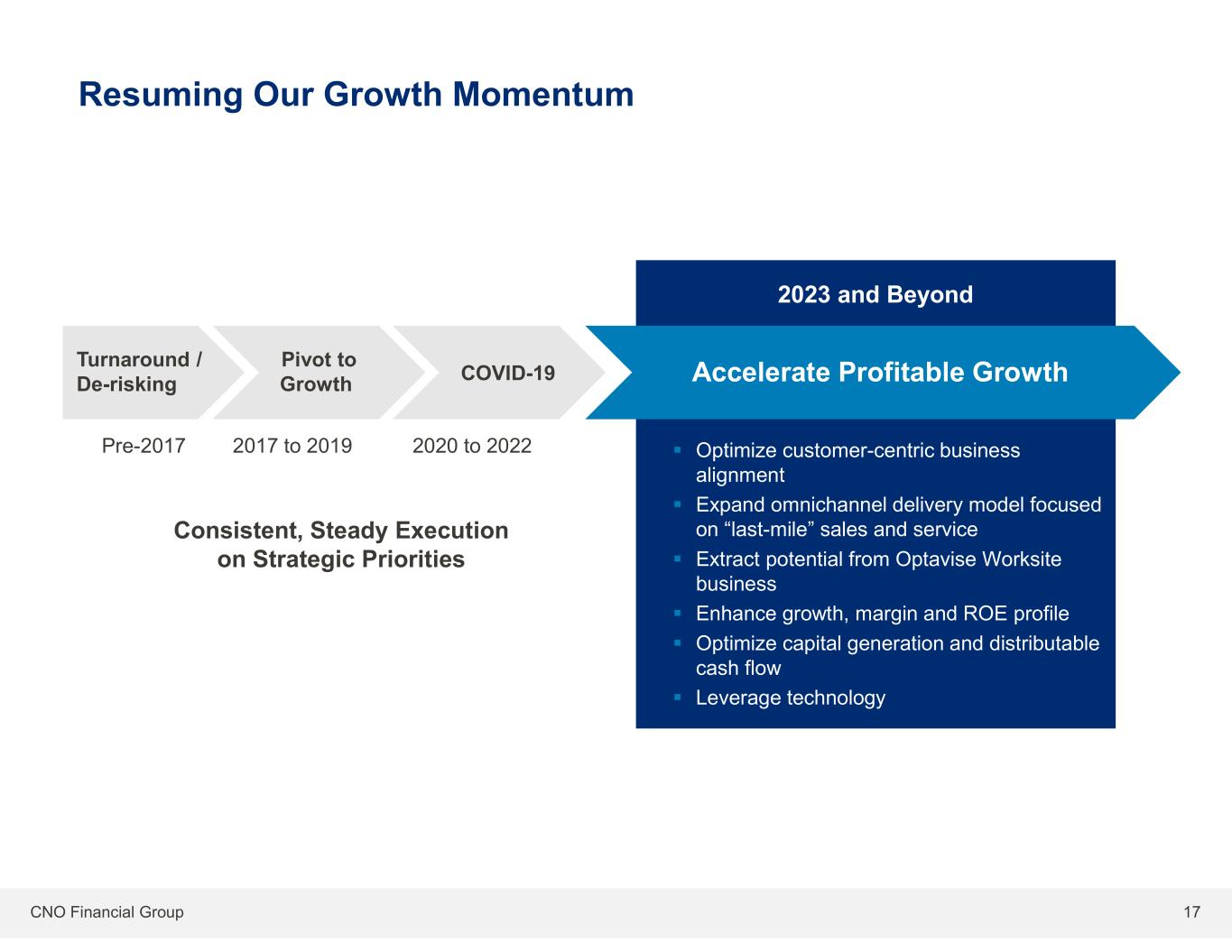 CNO Financial Group 17 Resuming Our Growth Momentum Turnaround / De-risking Pivot to Growth Pre-2017 2017 to 2019 2020 to 2022 COVID-19 Accelerate Profitable Growth  Optimize customer-centric business alignment  Expand omnichannel delivery model focused on “last-mile” sales and service  Extract potential from Optavise Worksite business  Enhance growth, margin and ROE profile  Optimize capital generation and distributable cash flow  Leverage technology 2023 and Beyond Consistent, Steady Execution on Strategic Priorities