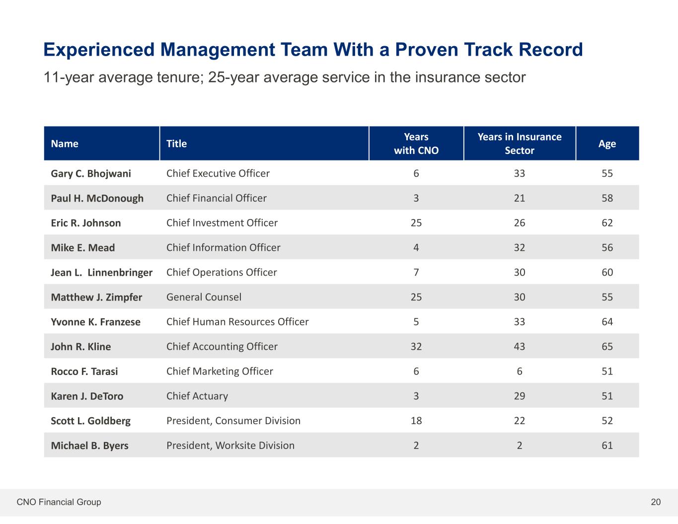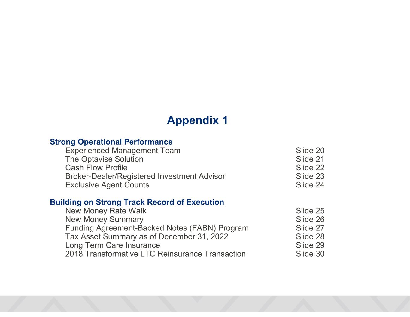 CNO Financial Group 19 Appendix 1 Strong Operational Performance Experienced Management Team Slide 20 The Optavise Solution Slide 21 Cash Flow Profile Slide 22 Broker-Dealer/Registered Investment Advisor Slide 23 Exclusive Agent Counts Slide 24 Building on Strong Track Record of Execution New Money Rate Walk Slide 25 New Money Summary Slide 26 Funding Agreement-Backed Notes (FABN) Program Slide 27 Tax Asset Summary as of December 31, 2022 Slide 28 Long Term Care Insurance Slide 29 2018 Transformative LTC Reinsurance Transaction Slide 30