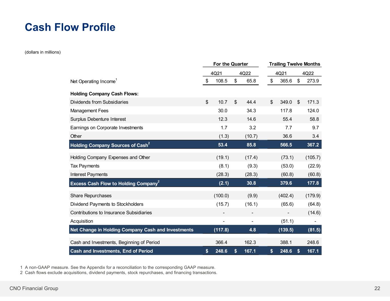 CNO Financial Group 22 Cash Flow Profile 1 A non-GAAP measure. See the Appendix for a reconciliation to the corresponding GAAP measure. 2 Cash flows exclude acquisitions, dividend payments, stock repurchases, and financing transactions. (dollars in millions) 4Q21 4Q22 4Q21 4Q22 Net Operating Income1 108.5$ 65.8$ 365.6$ 273.9$ Holding Company Cash Flows: Dividends from Subsidiaries 10.7$ 44.4$ 349.0$ 171.3$ Management Fees 30.0 34.3 117.8 124.0 Surplus Debenture Interest 12.3 14.6 55.4 58.8 Earnings on Corporate Investments 1.7 3.2 7.7 9.7 Other (1.3) (10.7) 36.6 3.4 Holding Company Sources of Cash 2 53.4 85.8 566.5 367.2 Holding Company Expenses and Other (19.1) (17.4) (73.1) (105.7) Tax Payments (8.1) (9.3) (53.0) (22.9) Interest Payments (28.3) (28.3) (60.8) (60.8) Excess Cash Flow to Holding Company 2 (2.1) 30.8 379.6 177.8 Share Repurchases (100.0) (9.9) (402.4) (179.9) Dividend Payments to Stockholders (15.7) (16.1) (65.6) (64.8) Contributions to Insurance Subsidiaries - - - (14.6) Acquisition - - (51.1) - Net Change in Holding Company Cash and Investments (117.8) 4.8 (139.5) (81.5) Cash and Investments, Beginning of Period 366.4 162.3 388.1 248.6 Cash and Investments, End of Period 248.6$ 167.1$ 248.6$ 167.1$ Trailing Twelve MonthsFor the Quarter