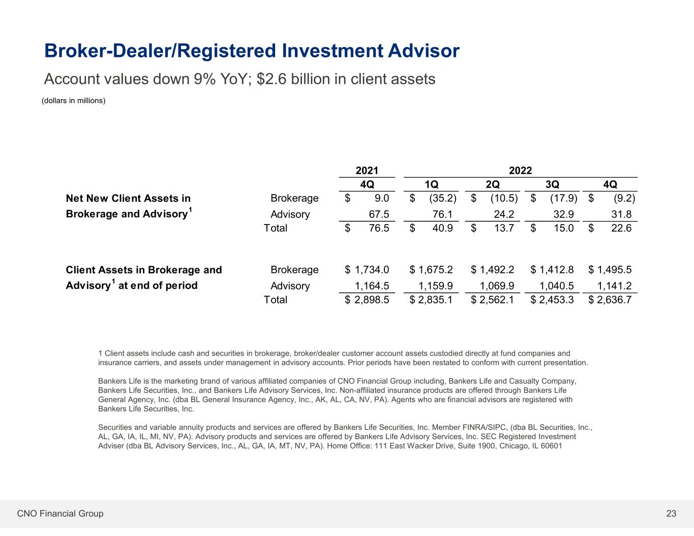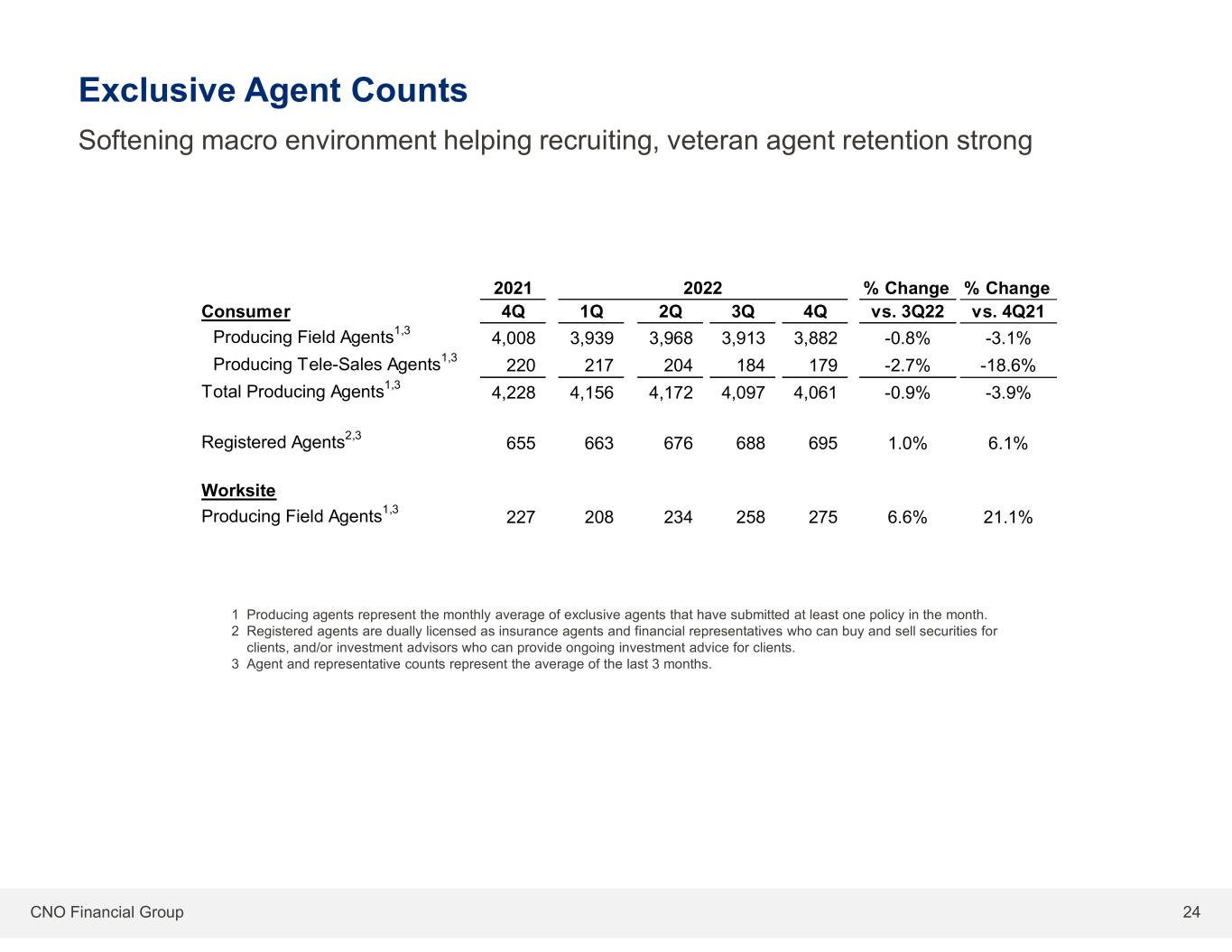 CNO Financial Group 23 Account values down 9% YoY; $2.6 billion in client assets Broker-Dealer/Registered Investment Advisor 1 Client assets include cash and securities in brokerage, broker/dealer customer account assets custodied directly at fund companies and insurance carriers, and assets under management in advisory accounts. Prior periods have been restated to conform with current presentation. Bankers Life is the marketing brand of various affiliated companies of CNO Financial Group including, Bankers Life and Casualty Company, Bankers Life Securities, Inc., and Bankers Life Advisory Services, Inc. Non-affiliated insurance products are offered through Bankers Life General Agency, Inc. (dba BL General Insurance Agency, Inc., AK, AL, CA, NV, PA). Agents who are financial advisors are registered with Bankers Life Securities, Inc. Securities and variable annuity products and services are offered by Bankers Life Securities, Inc. Member FINRA/SIPC, (dba BL Securities, Inc., AL, GA, IA, IL, MI, NV, PA). Advisory products and services are offered by Bankers Life Advisory Services, Inc. SEC Registered Investment Adviser (dba BL Advisory Services, Inc., AL, GA, IA, MT, NV, PA). Home Office: 111 East Wacker Drive, Suite 1900, Chicago, IL 60601 (dollars in millions) 4Q 1Q 2Q 3Q 4Q Net New Client Assets in Brokerage 9.0$ (35.2)$ (10.5)$ (17.9)$ (9.2)$ Brokerage and Advisory1 Advisory 67.5 76.1 24.2 32.9 31.8 Total 76.5$ 40.9$ 13.7$ 15.0$ 22.6$ Client Assets in Brokerage and Brokerage 1,734.0$ 1,675.2$ 1,492.2$ 1,412.8$ 1,495.5$ Advisory1 at end of period Advisory 1,164.5 1,159.9 1,069.9 1,040.5 1,141.2 Total 2,898.5$ 2,835.1$ 2,562.1$ 2,453.3$ 2,636.7$ 2021 2022