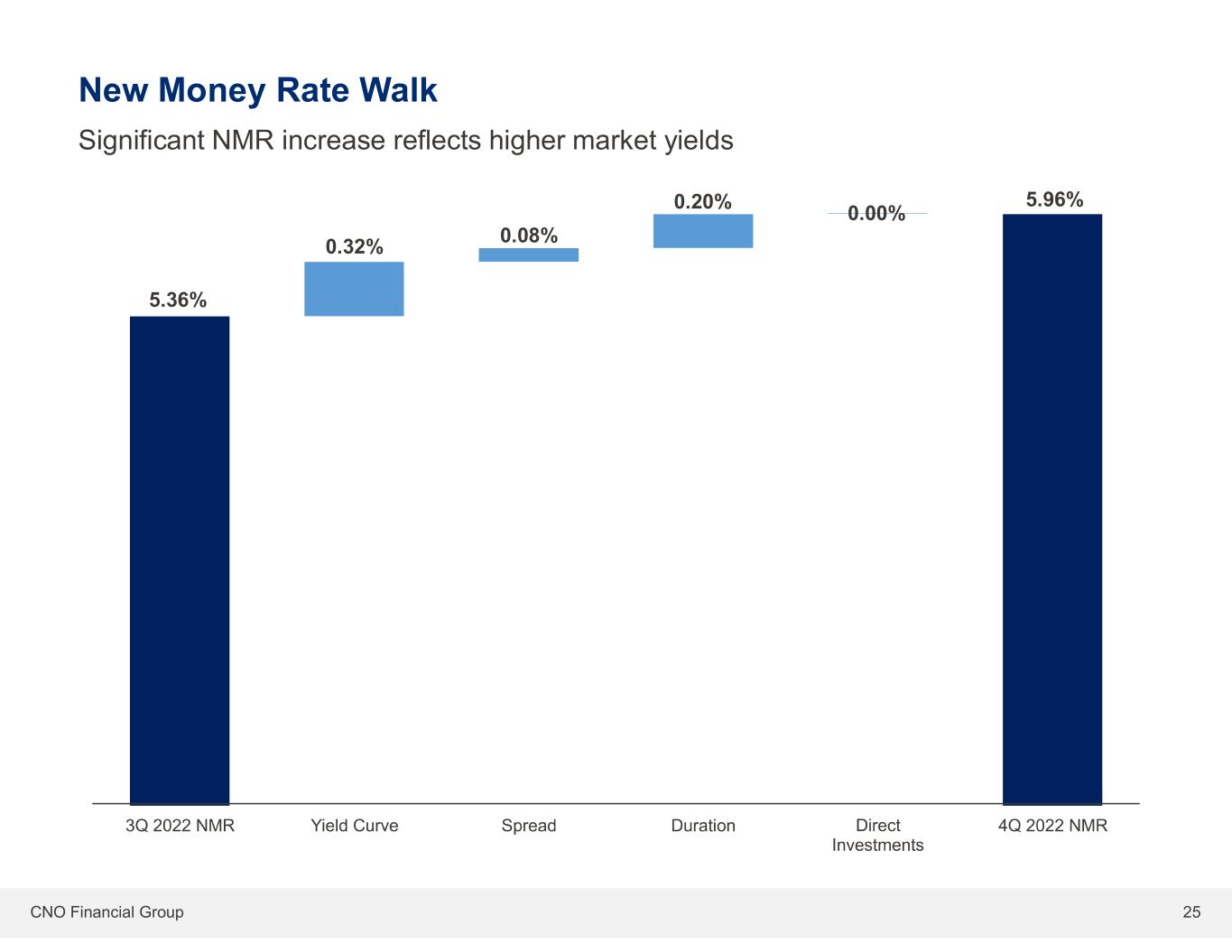 CNO Financial Group 24 Softening macro environment helping recruiting, veteran agent retention strong Exclusive Agent Counts 1 Producing agents represent the monthly average of exclusive agents that have submitted at least one policy in the month. 2 Registered agents are dually licensed as insurance agents and financial representatives who can buy and sell securities for clients, and/or investment advisors who can provide ongoing investment advice for clients. 3 Agent and representative counts represent the average of the last 3 months. % Change % Change Consumer 4Q 1Q 2Q 3Q 4Q vs. 3Q22 vs. 4Q21 Producing Field Agents1,3 4,008 3,939 3,968 3,913 3,882 -0.8% -3.1% Producing Tele-Sales Agents1,3 220 217 204 184 179 -2.7% -18.6% Total Producing Agents1,3 4,228 4,156 4,172 4,097 4,061 -0.9% -3.9% Registered Agents2,3 655 663 676 688 695 1.0% 6.1% Worksite Producing Field Agents1,3 227 208 234 258 275 6.6% 21.1% 2021 2022