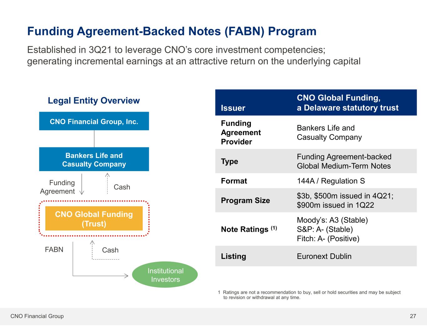 CNO Financial Group 27 Established in 3Q21 to leverage CNO’s core investment competencies; generating incremental earnings at an attractive return on the underlying capital Funding Agreement-Backed Notes (FABN) Program CNO Global Funding (Trust) Institutional Investors Funding Agreement FABN Cash Cash Bankers Life and Casualty Company CNO Financial Group, Inc. Legal Entity Overview Issuer CNO Global Funding, a Delaware statutory trust Funding Agreement Provider Bankers Life and Casualty Company Type Funding Agreement-backed Global Medium-Term Notes Format 144A / Regulation S Program Size $3b, $500m issued in 4Q21; $900m issued in 1Q22 Note Ratings (1) Moody’s: A3 (Stable) S&P: A- (Stable) Fitch: A- (Positive) Listing Euronext Dublin 1 Ratings are not a recommendation to buy, sell or hold securities and may be subject to revision or withdrawal at any time.