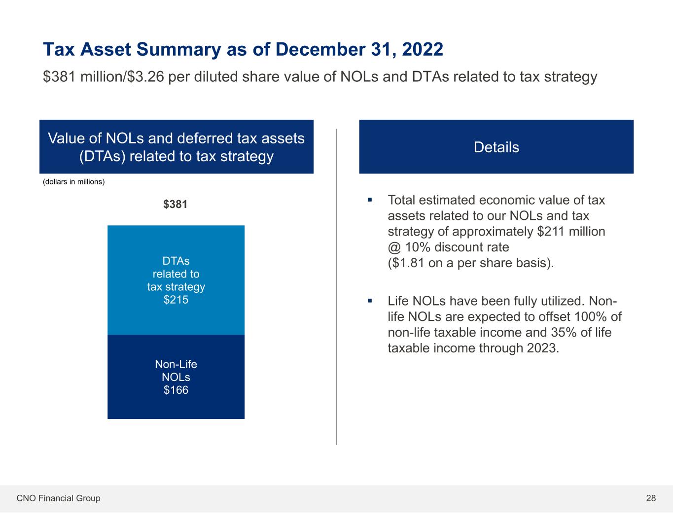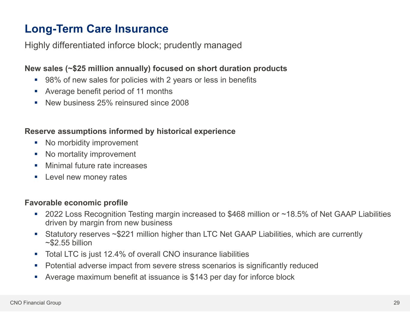 CNO Financial Group 28 Non-Life NOLs $166 DTAs related to tax strategy $215 Value of NOLs and deferred tax assets (DTAs) related to tax strategy Details  Total estimated economic value of tax assets related to our NOLs and tax strategy of approximately $211 million @ 10% discount rate ($1.81 on a per share basis).  Life NOLs have been fully utilized. Non- life NOLs are expected to offset 100% of non-life taxable income and 35% of life taxable income through 2023. $381 (dollars in millions) $381 million/$3.26 per diluted share value of NOLs and DTAs related to tax strategy Tax Asset Summary as of December 31, 2022