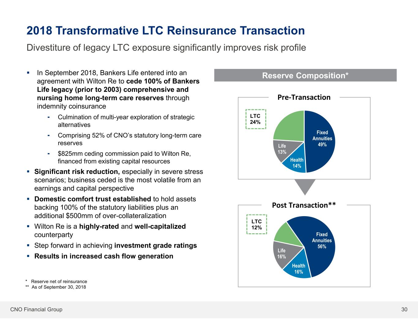 CNO Financial Group 29 New sales (~$25 million annually) focused on short duration products  98% of new sales for policies with 2 years or less in benefits  Average benefit period of 11 months  New business 25% reinsured since 2008 Reserve assumptions informed by historical experience  No morbidity improvement  No mortality improvement  Minimal future rate increases  Level new money rates Favorable economic profile  2022 Loss Recognition Testing margin increased to $468 million or ~18.5% of Net GAAP Liabilities driven by margin from new business  Statutory reserves ~$221 million higher than LTC Net GAAP Liabilities, which are currently ~$2.55 billion  Total LTC is just 12.4% of overall CNO insurance liabilities  Potential adverse impact from severe stress scenarios is significantly reduced  Average maximum benefit at issuance is $143 per day for inforce block Long-Term Care Insurance Highly differentiated inforce block; prudently managed