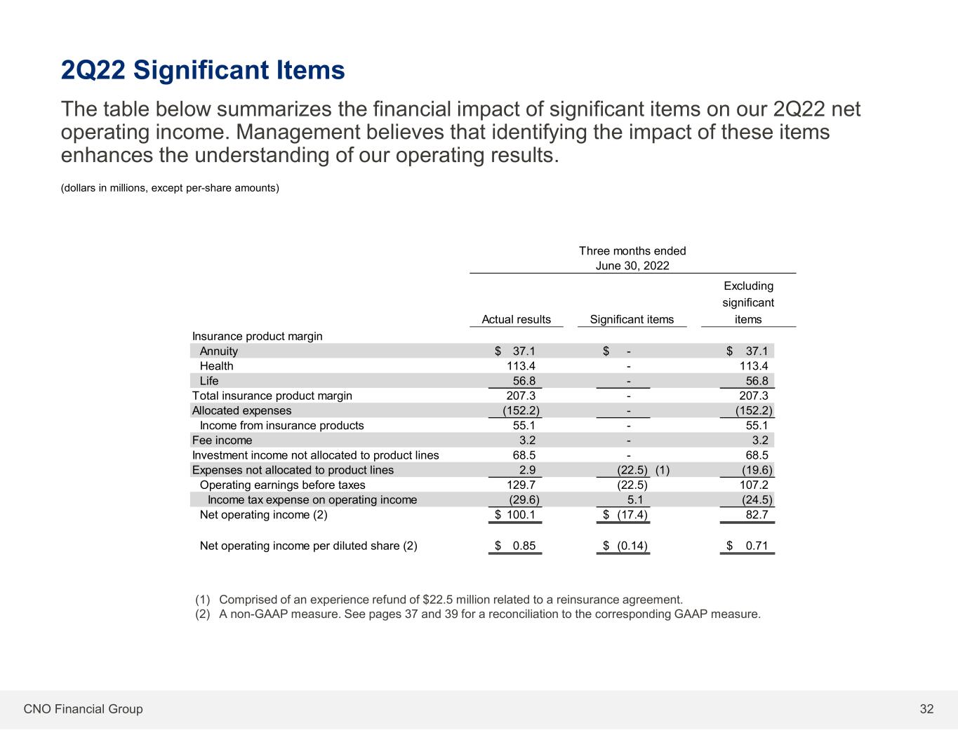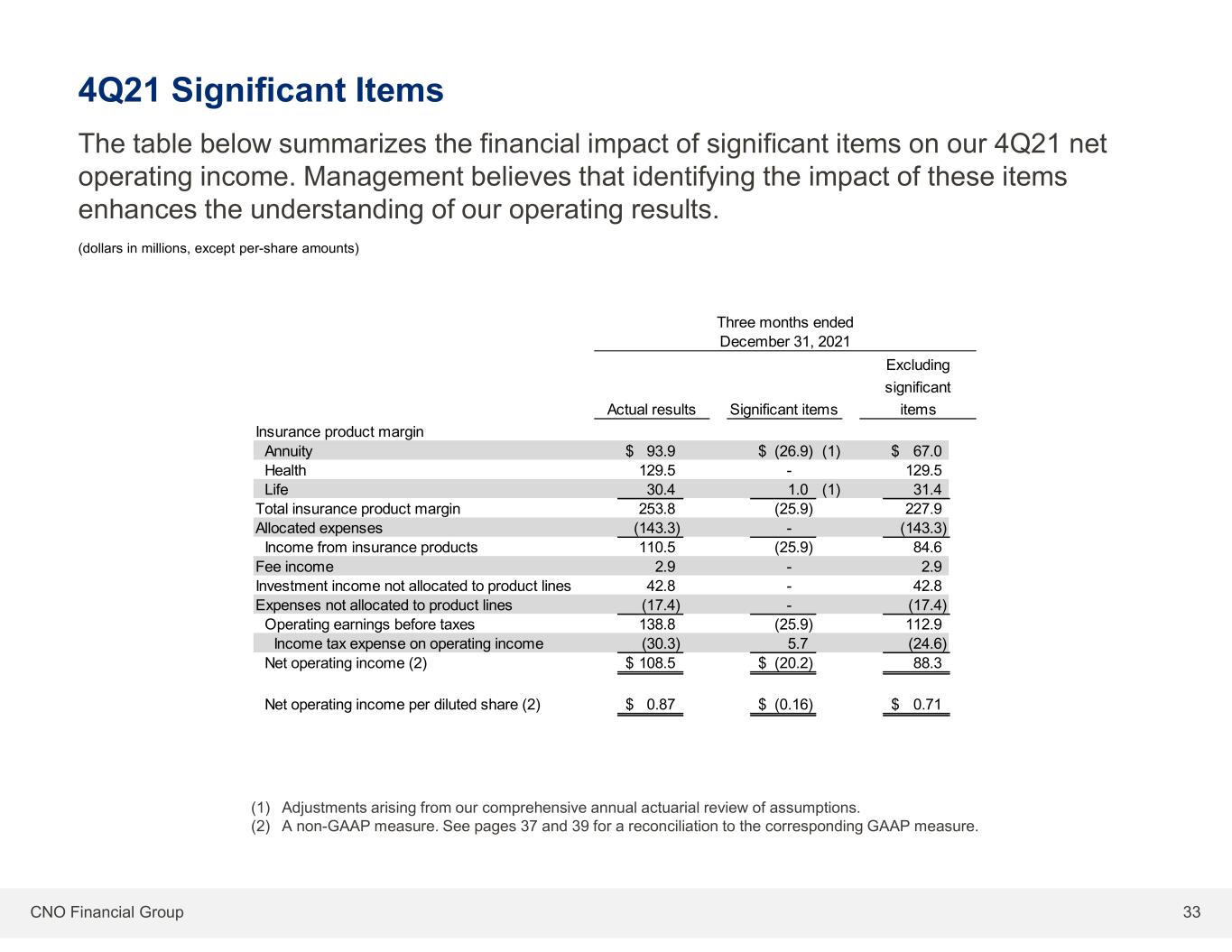 CNO Financial Group 32 Insurance product margin Annuity 37.1$ -$ 37.1$ Health 113.4 - 113.4 Life 56.8 - 56.8 Total insurance product margin 207.3 - 207.3 Allocated expenses (152.2) - (152.2) Income from insurance products 55.1 - 55.1 Fee income 3.2 - 3.2 Investment income not allocated to product lines 68.5 - 68.5 Expenses not allocated to product lines 2.9 (22.5) (1) (19.6) Operating earnings before taxes 129.7 (22.5) 107.2 Income tax expense on operating income (29.6) 5.1 (24.5) Net operating income (2) 100.1$ (17.4)$ 82.7 Net operating income per diluted share (2) 0.85$ (0.14)$ 0.71$ Three months ended June 30, 2022 Actual results Significant items Excluding significant items (dollars in millions, except per-share amounts) (1) Comprised of an experience refund of $22.5 million related to a reinsurance agreement. (2) A non-GAAP measure. See pages 37 and 39 for a reconciliation to the corresponding GAAP measure. The table below summarizes the financial impact of significant items on our 2Q22 net operating income. Management believes that identifying the impact of these items enhances the understanding of our operating results. 2Q22 Significant Items