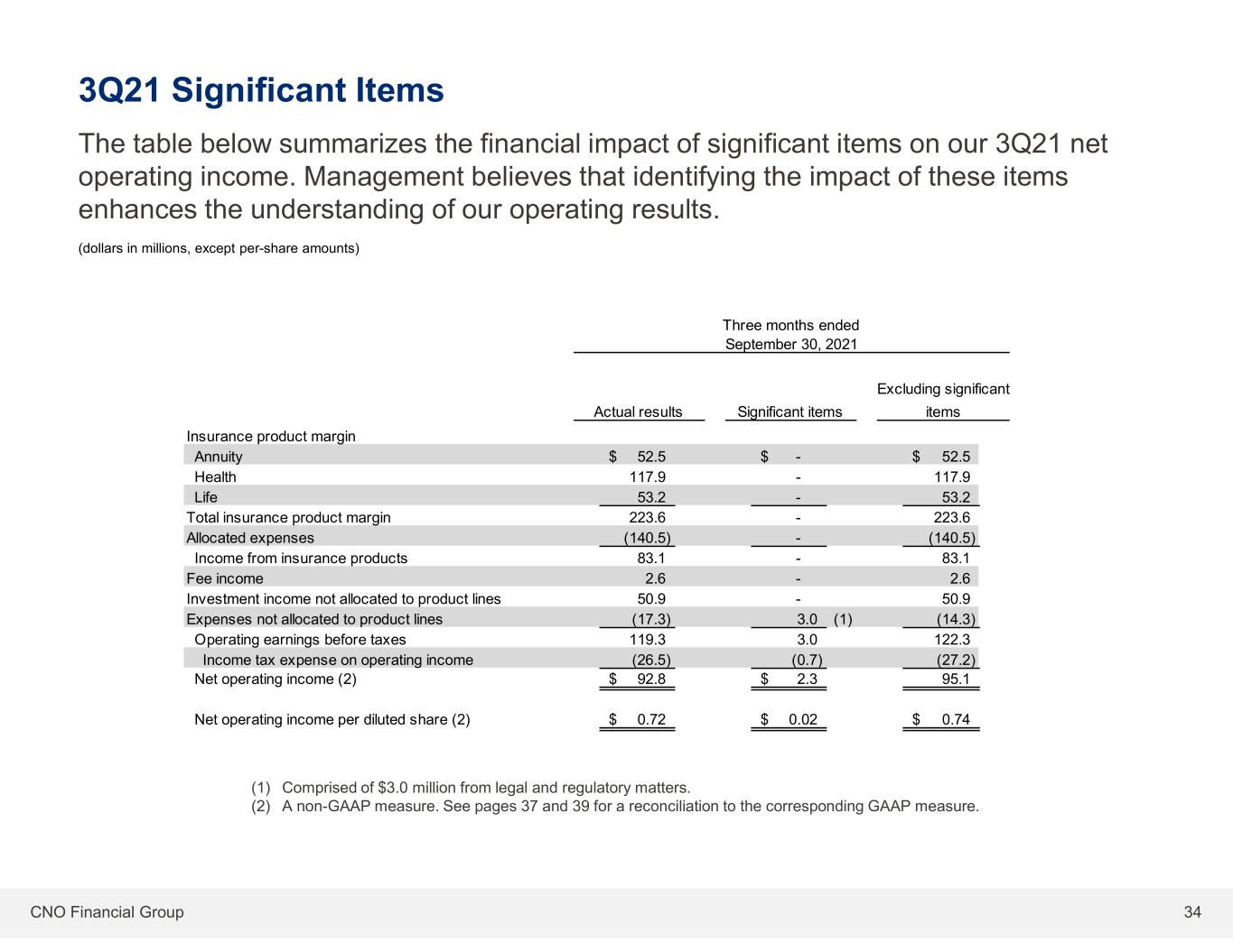 CNO Financial Group 33 (1) Adjustments arising from our comprehensive annual actuarial review of assumptions. (2) A non-GAAP measure. See pages 37 and 39 for a reconciliation to the corresponding GAAP measure. The table below summarizes the financial impact of significant items on our 4Q21 net operating income. Management believes that identifying the impact of these items enhances the understanding of our operating results. 4Q21 Significant Items Insurance product margin Annuity 93.9$ (26.9)$ (1) 67.0$ Health 129.5 - 129.5 Life 30.4 1.0 (1) 31.4 Total insurance product margin 253.8 (25.9) 227.9 Allocated expenses (143.3) - (143.3) Income from insurance products 110.5 (25.9) 84.6 Fee income 2.9 - 2.9 Investment income not allocated to product lines 42.8 - 42.8 Expenses not allocated to product lines (17.4) - (17.4) Operating earnings before taxes 138.8 (25.9) 112.9 Income tax expense on operating income (30.3) 5.7 (24.6) Net operating income (2) 108.5$ (20.2)$ 88.3 Net operating income per diluted share (2) 0.87$ (0.16)$ 0.71$ Three months ended December 31, 2021 Actual results Significant items Excluding significant items (dollars in millions, except per-share amounts)