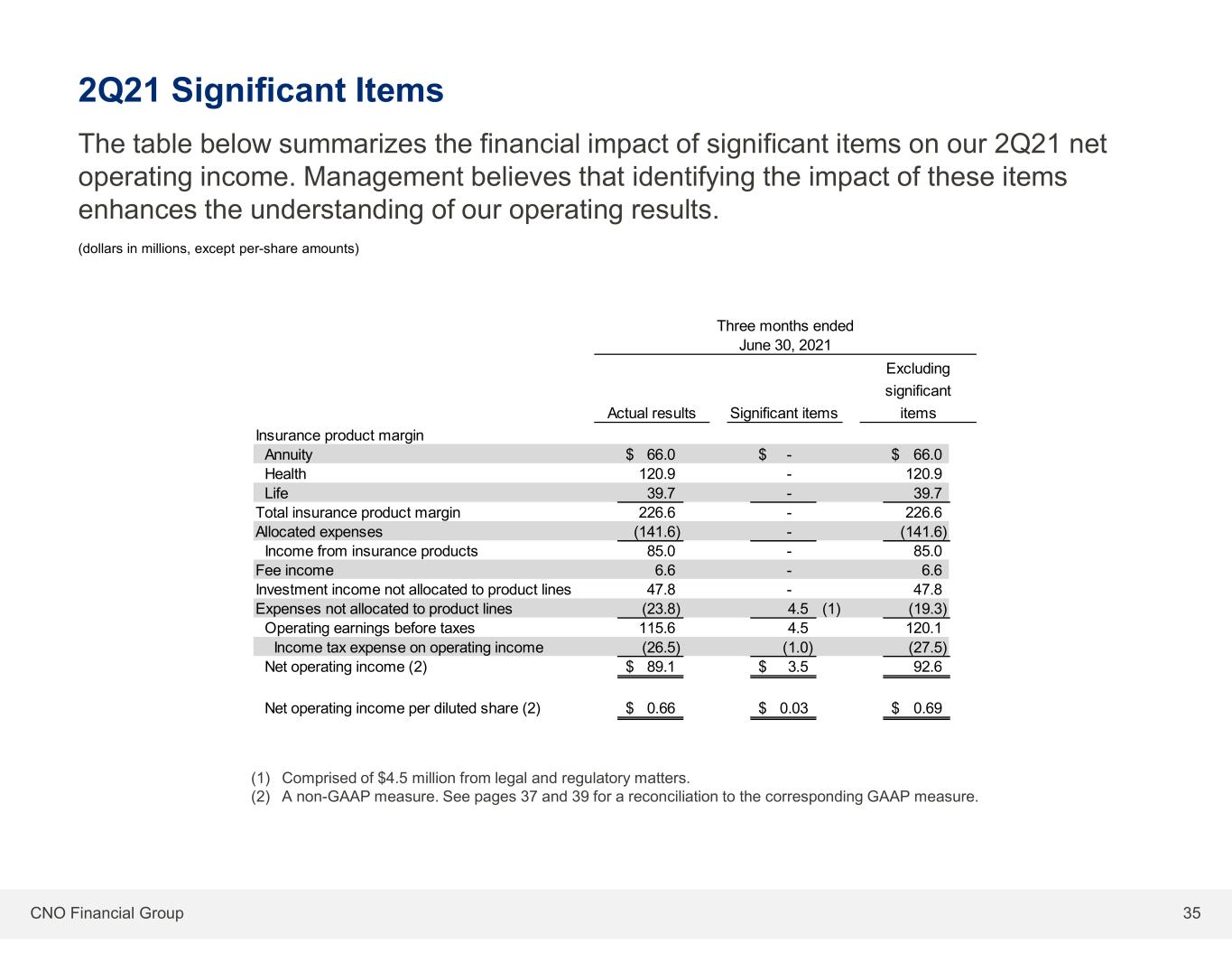 CNO Financial Group 34 (1) Comprised of $3.0 million from legal and regulatory matters. (2) A non-GAAP measure. See pages 37 and 39 for a reconciliation to the corresponding GAAP measure. Insurance product margin Annuity 52.5$ -$ 52.5$ Health 117.9 - 117.9 Life 53.2 - 53.2 Total insurance product margin 223.6 - 223.6 Allocated expenses (140.5) - (140.5) Income from insurance products 83.1 - 83.1 Fee income 2.6 - 2.6 Investment income not allocated to product lines 50.9 - 50.9 Expenses not allocated to product lines (17.3) 3.0 (1) (14.3) Operating earnings before taxes 119.3 3.0 122.3 Income tax expense on operating income (26.5) (0.7) (27.2) Net operating income (2) 92.8$ 2.3$ 95.1 Net operating income per diluted share (2) 0.72$ 0.02$ 0.74$ Three months ended September 30, 2021 Actual results Significant items Excluding significant items The table below summarizes the financial impact of significant items on our 3Q21 net operating income. Management believes that identifying the impact of these items enhances the understanding of our operating results. 3Q21 Significant Items (dollars in millions, except per-share amounts)