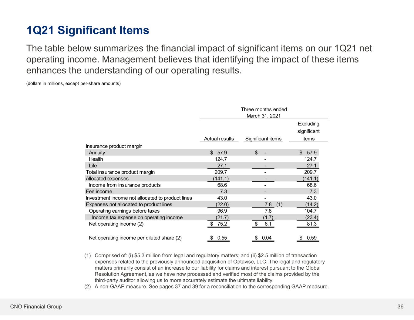 CNO Financial Group 35 Insurance product margin Annuity 66.0$ -$ 66.0$ Health 120.9 - 120.9 Life 39.7 - 39.7 Total insurance product margin 226.6 - 226.6 Allocated expenses (141.6) - (141.6) Income from insurance products 85.0 - 85.0 Fee income 6.6 - 6.6 Investment income not allocated to product lines 47.8 - 47.8 Expenses not allocated to product lines (23.8) 4.5 (1) (19.3) Operating earnings before taxes 115.6 4.5 120.1 Income tax expense on operating income (26.5) (1.0) (27.5) Net operating income (2) 89.1$ 3.5$ 92.6 Net operating income per diluted share (2) 0.66$ 0.03$ 0.69$ Three months ended June 30, 2021 Actual results Significant items Excluding significant items (1) Comprised of $4.5 million from legal and regulatory matters. (2) A non-GAAP measure. See pages 37 and 39 for a reconciliation to the corresponding GAAP measure. The table below summarizes the financial impact of significant items on our 2Q21 net operating income. Management believes that identifying the impact of these items enhances the understanding of our operating results. 2Q21 Significant Items (dollars in millions, except per-share amounts)