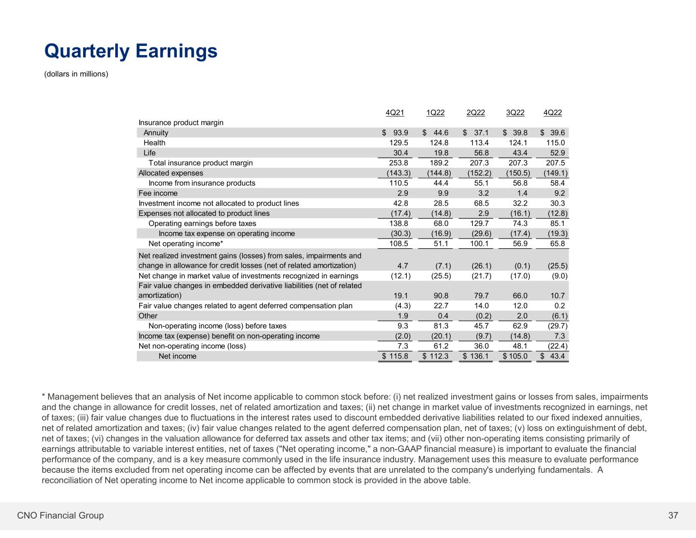 CNO Financial Group 37 (dollars in millions) * Management believes that an analysis of Net income applicable to common stock before: (i) net realized investment gains or losses from sales, impairments and the change in allowance for credit losses, net of related amortization and taxes; (ii) net change in market value of investments recognized in earnings, net of taxes; (iii) fair value changes due to fluctuations in the interest rates used to discount embedded derivative liabilities related to our fixed indexed annuities, net of related amortization and taxes; (iv) fair value changes related to the agent deferred compensation plan, net of taxes; (v) loss on extinguishment of debt, net of taxes; (vi) changes in the valuation allowance for deferred tax assets and other tax items; and (vii) other non-operating items consisting primarily of earnings attributable to variable interest entities, net of taxes ("Net operating income," a non-GAAP financial measure) is important to evaluate the financial performance of the company, and is a key measure commonly used in the life insurance industry. Management uses this measure to evaluate performance because the items excluded from net operating income can be affected by events that are unrelated to the company's underlying fundamentals. A reconciliation of Net operating income to Net income applicable to common stock is provided in the above table. Quarterly Earnings 4Q21 1Q22 2Q22 3Q22 4Q22 Insurance product margin Annuity 93.9$ 44.6$ 37.1$ 39.8$ 39.6$ Health 129.5 124.8 113.4 124.1 115.0 Life 30.4 19.8 56.8 43.4 52.9 Total insurance product margin 253.8 189.2 207.3 207.3 207.5 Allocated expenses (143.3) (144.8) (152.2) (150.5) (149.1) Income from insurance products 110.5 44.4 55.1 56.8 58.4 Fee income 2.9 9.9 3.2 1.4 9.2 Investment income not allocated to product lines 42.8 28.5 68.5 32.2 30.3 Expenses not allocated to product lines (17.4) (14.8) 2.9 (16.1) (12.8) Operating earnings before taxes 138.8 68.0 129.7 74.3 85.1 Income tax expense on operating income (30.3) (16.9) (29.6) (17.4) (19.3) Net operating income* 108.5 51.1 100.1 56.9 65.8 Net realized investment gains (losses) from sales, impairments and change in allowance for credit losses (net of related amortization) 4.7 (7.1) (26.1) (0.1) (25.5) Net change in market value of investments recognized in earnings (12.1) (25.5) (21.7) (17.0) (9.0) Fair value changes in embedded derivative liabilities (net of related amortization) 19.1 90.8 79.7 66.0 10.7 Fair value changes related to agent deferred compensation plan (4.3) 22.7 14.0 12.0 0.2 Other 1.9 0.4 (0.2) 2.0 (6.1) Non-operating income (loss) before taxes 9.3 81.3 45.7 62.9 (29.7) Income tax (expense) benefit on non-operating income (2.0) (20.1) (9.7) (14.8) 7.3 Net non-operating income (loss) 7.3 61.2 36.0 48.1 (22.4) Net income 115.8$ 112.3$ 136.1$ 105.0$ 43.4$