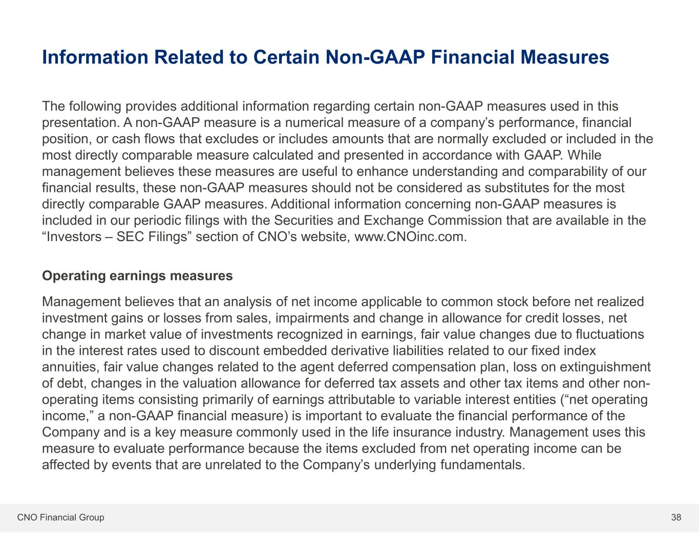 CNO Financial Group 38 Information Related to Certain Non-GAAP Financial Measures The following provides additional information regarding certain non-GAAP measures used in this presentation. A non-GAAP measure is a numerical measure of a company’s performance, financial position, or cash flows that excludes or includes amounts that are normally excluded or included in the most directly comparable measure calculated and presented in accordance with GAAP. While management believes these measures are useful to enhance understanding and comparability of our financial results, these non-GAAP measures should not be considered as substitutes for the most directly comparable GAAP measures. Additional information concerning non-GAAP measures is included in our periodic filings with the Securities and Exchange Commission that are available in the “Investors – SEC Filings” section of CNO’s website, www.CNOinc.com. Operating earnings measures Management believes that an analysis of net income applicable to common stock before net realized investment gains or losses from sales, impairments and change in allowance for credit losses, net change in market value of investments recognized in earnings, fair value changes due to fluctuations in the interest rates used to discount embedded derivative liabilities related to our fixed index annuities, fair value changes related to the agent deferred compensation plan, loss on extinguishment of debt, changes in the valuation allowance for deferred tax assets and other tax items and other non- operating items consisting primarily of earnings attributable to variable interest entities (“net operating income,” a non-GAAP financial measure) is important to evaluate the financial performance of the Company and is a key measure commonly used in the life insurance industry. Management uses this measure to evaluate performance because the items excluded from net operating income can be affected by events that are unrelated to the Company’s underlying fundamentals.