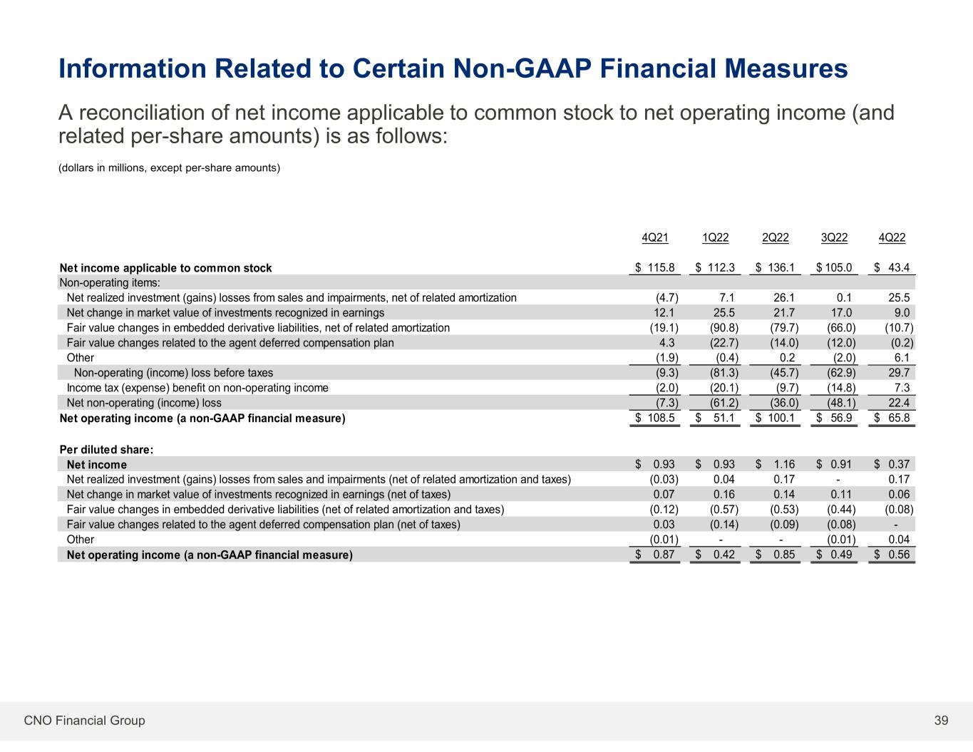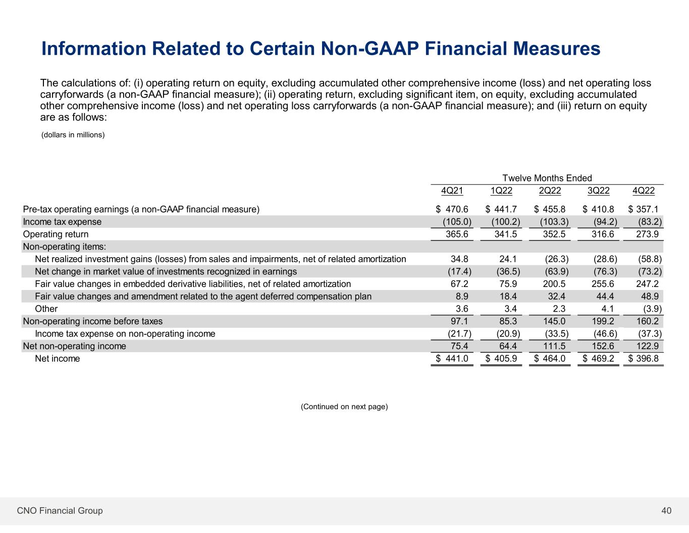CNO Financial Group 39 A reconciliation of net income applicable to common stock to net operating income (and related per-share amounts) is as follows: (dollars in millions, except per-share amounts) Information Related to Certain Non-GAAP Financial Measures 4Q21 1Q22 2Q22 3Q22 4Q22 Net income applicable to common stock 115.8$ 112.3$ 136.1$ 105.0$ 43.4$ Non-operating items: Net realized investment (gains) losses from sales and impairments, net of related amortization (4.7) 7.1 26.1 0.1 25.5 Net change in market value of investments recognized in earnings 12.1 25.5 21.7 17.0 9.0 Fair value changes in embedded derivative liabilities, net of related amortization (19.1) (90.8) (79.7) (66.0) (10.7) Fair value changes related to the agent deferred compensation plan 4.3 (22.7) (14.0) (12.0) (0.2) Other (1.9) (0.4) 0.2 (2.0) 6.1 Non-operating (income) loss before taxes (9.3) (81.3) (45.7) (62.9) 29.7 Income tax (expense) benefit on non-operating income (2.0) (20.1) (9.7) (14.8) 7.3 Net non-operating (income) loss (7.3) (61.2) (36.0) (48.1) 22.4 Net operating income (a non-GAAP financial measure) 108.5$ 51.1$ 100.1$ 56.9$ 65.8$ Per diluted share: Net income 0.93$ 0.93$ 1.16$ 0.91$ 0.37$ Net realized investment (gains) losses from sales and impairments (net of related amortization and taxes) (0.03) 0.04 0.17 - 0.17 Net change in market value of investments recognized in earnings (net of taxes) 0.07 0.16 0.14 0.11 0.06 Fair value changes in embedded derivative liabilities (net of related amortization and taxes) (0.12) (0.57) (0.53) (0.44) (0.08) Fair value changes related to the agent deferred compensation plan (net of taxes) 0.03 (0.14) (0.09) (0.08) - Other (0.01) - - (0.01) 0.04 Net operating income (a non-GAAP financial measure) 0.87$ 0.42$ 0.85$ 0.49$ 0.56$