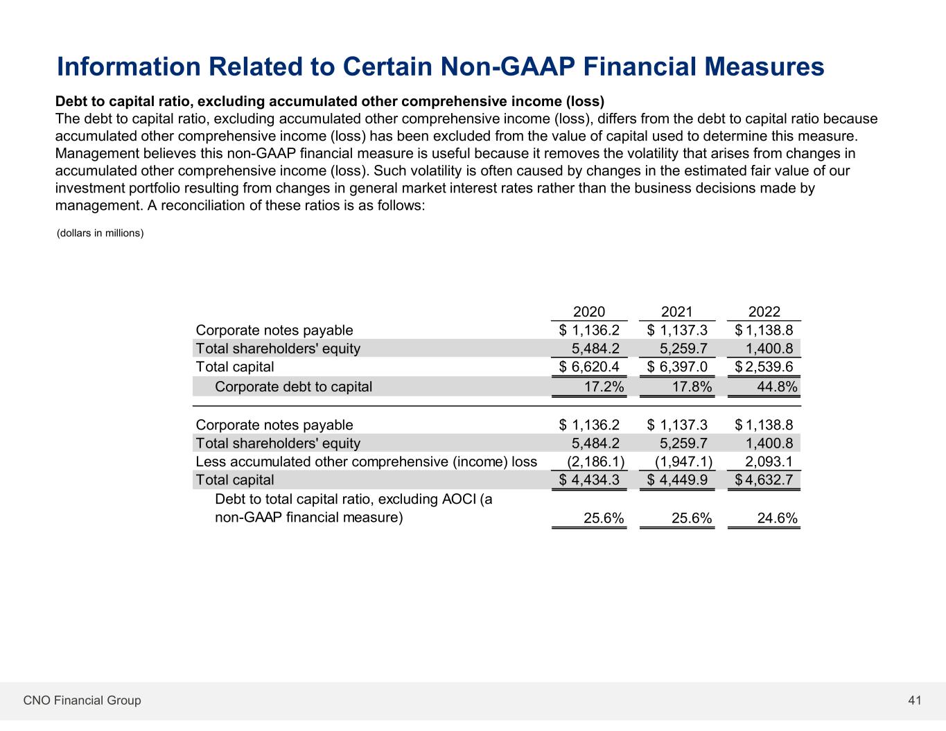 CNO Financial Group 41 Debt to capital ratio, excluding accumulated other comprehensive income (loss) The debt to capital ratio, excluding accumulated other comprehensive income (loss), differs from the debt to capital ratio because accumulated other comprehensive income (loss) has been excluded from the value of capital used to determine this measure. Management believes this non-GAAP financial measure is useful because it removes the volatility that arises from changes in accumulated other comprehensive income (loss). Such volatility is often caused by changes in the estimated fair value of our investment portfolio resulting from changes in general market interest rates rather than the business decisions made by management. A reconciliation of these ratios is as follows: (dollars in millions) Information Related to Certain Non-GAAP Financial Measures 2020 2021 2022 Corporate notes payable 1,136.2$ 1,137.3$ 1,138.8$ Total shareholders' equity 5,484.2 5,259.7 1,400.8 Total capital 6,620.4$ 6,397.0$ 2,539.6$ Corporate debt to capital 17.2% 17.8% 44.8% Corporate notes payable 1,136.2$ 1,137.3$ 1,138.8$ Total shareholders' equity 5,484.2 5,259.7 1,400.8 Less accumulated other comprehensive (income) loss (2,186.1) (1,947.1) 2,093.1 Total capital 4,434.3$ 4,449.9$ 4,632.7$ Debt to total capital ratio, excluding AOCI (a non-GAAP financial measure) 25.6% 25.6% 24.6%