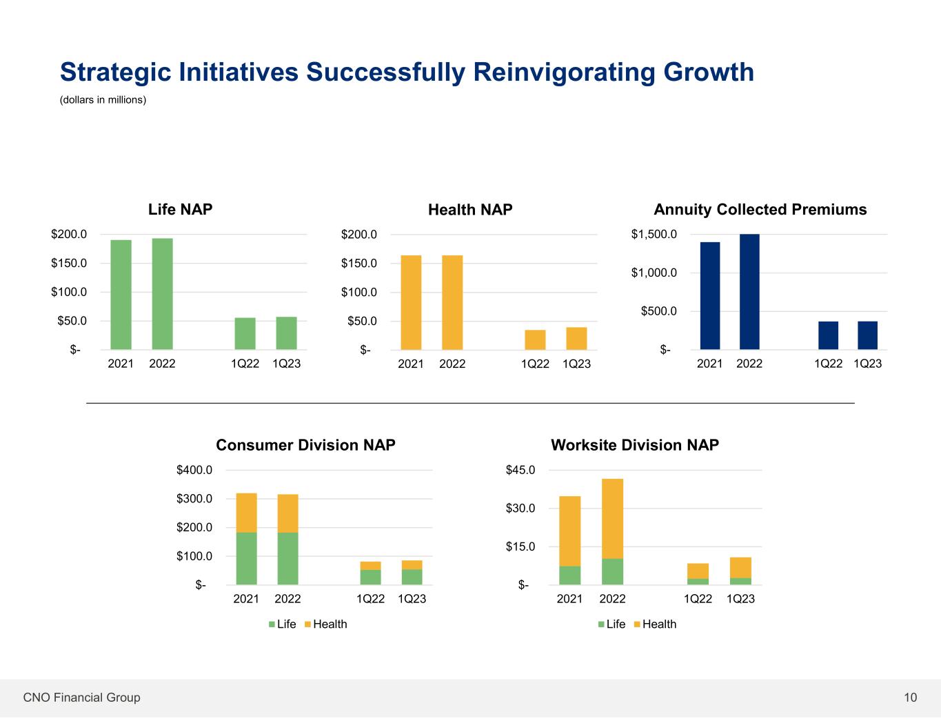 CNO Financial Group 2 Important Legal Information Certain statements made in this presentation should be considered forward-looking statements as defined in the Private Securities Litigation Reform Act of 1995. These include statements about future results of operations and capital plans. We caution investors that these forward-looking statements are not guarantees of future performance, and actual results may differ materially. Investors should consider the important risks and uncertainties that may cause actual results to differ, including those included in our press release issued on May 1, 2023, our Quarterly Reports on Form 10-Q, our Annual Report on Form 10-K and other filings we make with the Securities and Exchange Commission. We assume no obligation to update this presentation, which speaks as of today’s date. Forward-Looking Statements This presentation contains financial measures that differ from the comparable measures under Generally Accepted Accounting Principles (GAAP). Reconciliations between those non-GAAP measures and the comparable GAAP measures are included in the Appendix, or on the page such measure is presented. While management believes the measures are useful to enhance understanding and comparability of our financial results, these non-GAAP measures should not be considered substitutes for the most directly comparable GAAP measures. Additional information concerning non-GAAP measures is included in our periodic filings with the Securities and Exchange Commission that are available in the “Investors – Financials – SEC Filings” section of CNO’s website, CNOinc.com. Non-GAAP Measures Effective January 1, 2023, we adopted ASU 2018-12 related to targeted improvements to the accounting for long-duration insurance contracts. Concurrent with the adoption of the new guidance, we updated the method of determining non- operating earnings for our fixed indexed annuities to better identify the volatile non-economic accounting impacts of that line of business. As a result of the adoption of the new guidance and methodology, certain historical amounts have changed. Our quarterly financial supplement – 4Q22 as recast to reflect the new standard is available in the “Investors – Financials – Quarterly Earnings” section of CNO’s website, CNOinc.com. Adoption of New Accounting Standard