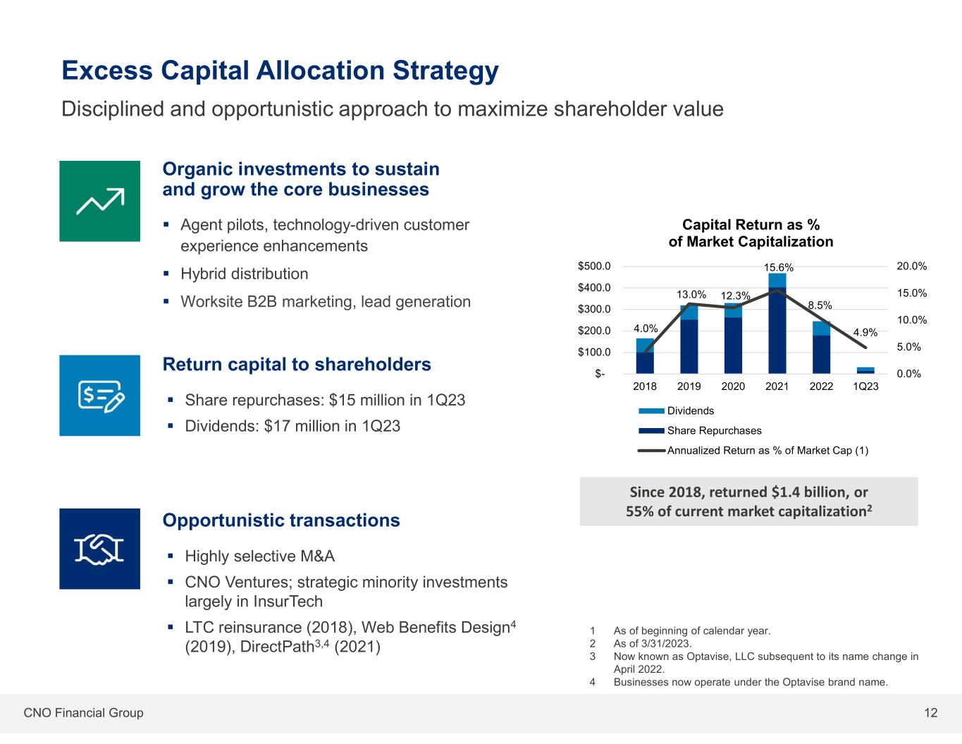 CNO Financial Group 12  Agent pilots, technology-driven customer experience enhancements  Hybrid distribution  Worksite B2B marketing, lead generation  Share repurchases: $15 million in 1Q23  Dividends: $17 million in 1Q23 Return capital to shareholders Organic investments to sustain and grow the core businesses Disciplined and opportunistic approach to maximize shareholder value Excess Capital Allocation Strategy 4.0% 13.0% 12.3% 15.6% 8.5% 4.9% 0.0% 5.0% 10.0% 15.0% 20.0% $- $100.0 $200.0 $300.0 $400.0 $500.0 2018 2019 2020 2021 2022 1Q23 Capital Return as % of Market Capitalization Dividends Share Repurchases Annualized Return as % of Market Cap (1)  Highly selective M&A  CNO Ventures; strategic minority investments largely in InsurTech  LTC reinsurance (2018), Web Benefits Design4 (2019), DirectPath3,4 (2021) Opportunistic transactions Since 2018, returned $1.4 billion, or 55% of current market capitalization2 1 As of beginning of calendar year. 2 As of 3/31/2023. 3 Now known as Optavise, LLC subsequent to its name change in April 2022. 4 Businesses now operate under the Optavise brand name.
