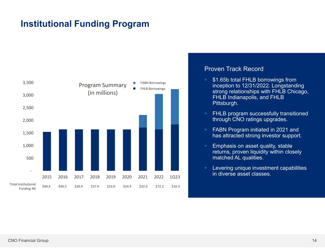 CNO Financial Group 14 Institutional Funding Program Proven Track Record  $1.65b total FHLB borrowings from inception to 12/31/2022. Longstanding strong relationships with FHLB Chicago, FHLB Indianapolis, and FHLB Pittsburgh.  FHLB program successfully transitioned through CNO ratings upgrades.  FABN Program initiated in 2021 and has attracted strong investor support.  Emphasis on asset quality, stable returns, proven liquidity within closely matched AL qualities.  Levering unique investment capabilities in diverse asset classes. Total Institutional Funding NII $40.4 $40.5 $39.9 $37.9 $23.0 $24.9 $32.6 $72.2 $16.3 - 500 1,000 1,500 2,000 2,500 3,000 3,500 2015 2016 2017 2018 2019 2020 2021 2022 1Q23 Program Summary (in millions) FABN Borrowings FHLB Borrowings