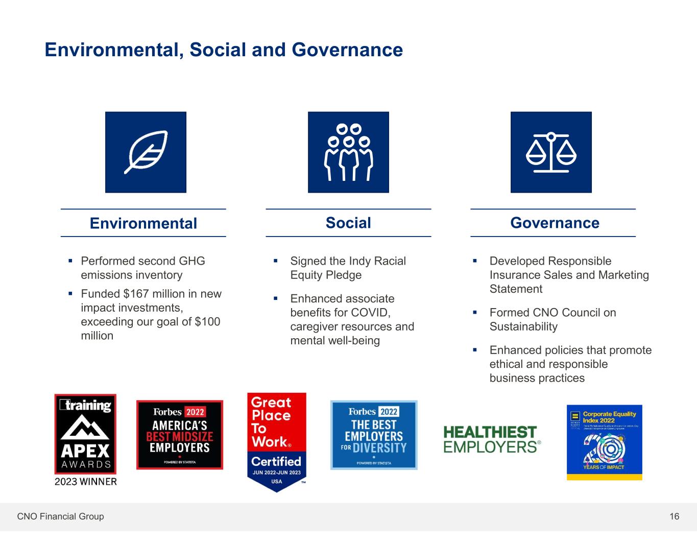 CNO Financial Group 15 2023 Outlook1 1Applying LDTI, the new FIA operating income methodology, and excluding significant items. Free Cash Flow / Excess Capital Earnings  375% consolidated RBC ratio target  Target leverage of 25.0% – 28.0%  $170mm – $200mm of excess cash flow to holdco before impact of Bermuda captive reinsurance structure  EPS range of $2.80 – $3.00  19.0 – 19.4% expense ratio  23.0 – 24.0% effective tax rate Bermuda reinsurance captive  Contingent on all necessary regulatory approvals, we expect excess cash flow to the holdco to increase by $150 - $200 million at inception of the reinsurance treaty