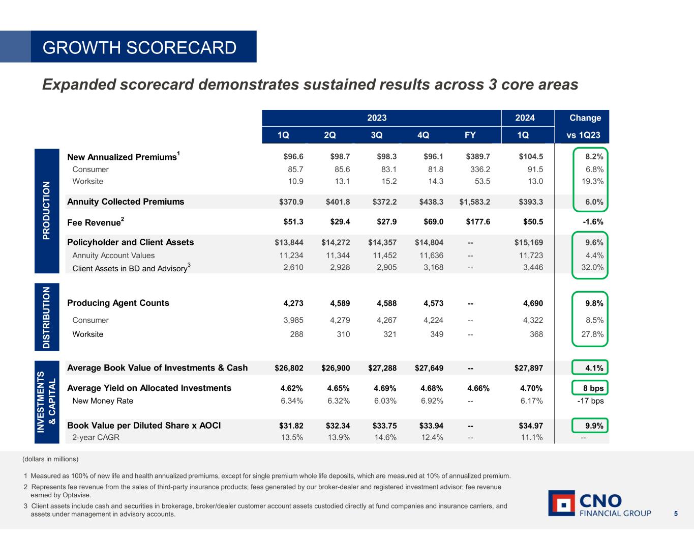 4 1 A non-GAAP measure. See the Appendix for a reconciliation to the corresponding GAAP measure. 2 Pre-tax. Operational Highlights  7th consecutive quarter of strong sales momentum – Total new annualized premium (NAP) up 8% – Sales growth in nearly all product categories  Total producing agent count (PAC) up 10%, 5th consecutive quarter of growth  Growth in brokerage and advisory for the 4th consecutive quarter  Recent new product introductions meaningfully contributing to growth Financial Highlights QUARTER IN REVIEW Strong start to 2024, continuing track record of sustainable growth  Operating EPS1 of $0.52 – Favorable total net investment income and insurance product margin, offset by $24.3 million2 of net unfavorable mark-to-market impacts on real estate partnerships within the alternative investment portfolio  New money rate above 6% for the 5th consecutive quarter  Capital and liquidity remain above target levels  Returned $57 million to shareholders  Book value per diluted share excluding AOCI1 was $34.97, up 10%