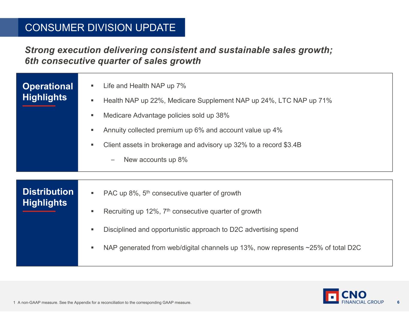 61 A non-GAAP measure. See the Appendix for a reconciliation to the corresponding GAAP measure. CONSUMER DIVISION UPDATE Strong execution delivering consistent and sustainable sales growth; 6th consecutive quarter of sales growth  PAC up 8%, 5th consecutive quarter of growth  Recruiting up 12%, 7th consecutive quarter of growth  Disciplined and opportunistic approach to D2C advertising spend  NAP generated from web/digital channels up 13%, now represents ~25% of total D2C  Life and Health NAP up 7%  Health NAP up 22%, Medicare Supplement NAP up 24%, LTC NAP up 71%  Medicare Advantage policies sold up 38%  Annuity collected premium up 6% and account value up 4%  Client assets in brokerage and advisory up 32% to a record $3.4B – New accounts up 8% Operational Highlights Distribution Highlights
