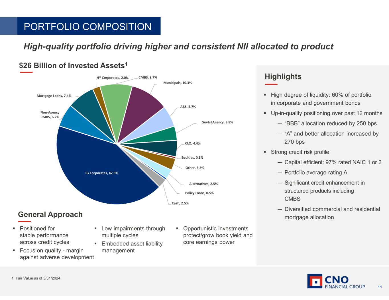 2 Certain statements made in this presentation should be considered forward-looking statements as defined in the Private Securities Litigation Reform Act of 1995. These include statements about future results of operations and capital plans. We caution investors that these forward-looking statements are not guarantees of future performance, and actual results may differ materially. Investors should consider the important risks and uncertainties that may cause actual results to differ, including those included in our press release issued on April 29, 2024, our Quarterly Reports on Form 10-Q, our Annual Report on Form 10-K and other filings we make with the Securities and Exchange Commission. We assume no obligation to update this presentation, which speaks as of today’s date. Forward-Looking Statements This presentation contains financial measures that differ from the comparable measures under Generally Accepted Accounting Principles (GAAP). Reconciliations between those non-GAAP measures and the comparable GAAP measures are included in the Appendix, or on the page such measure is presented. While management believes the measures are useful to enhance understanding and comparability of our financial results, these non-GAAP measures should not be considered substitutes for the most directly comparable GAAP measures. Additional information concerning non-GAAP measures is included in our periodic filings with the Securities and Exchange Commission that are available in the “Investors – Financials – SEC Filings” section of CNO’s website, CNOinc.com. Non-GAAP Measures IMPORTANT LEGAL INFORMATION