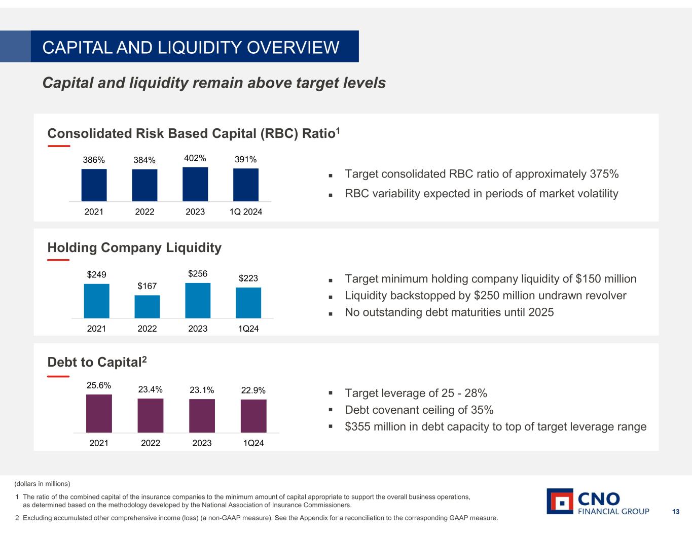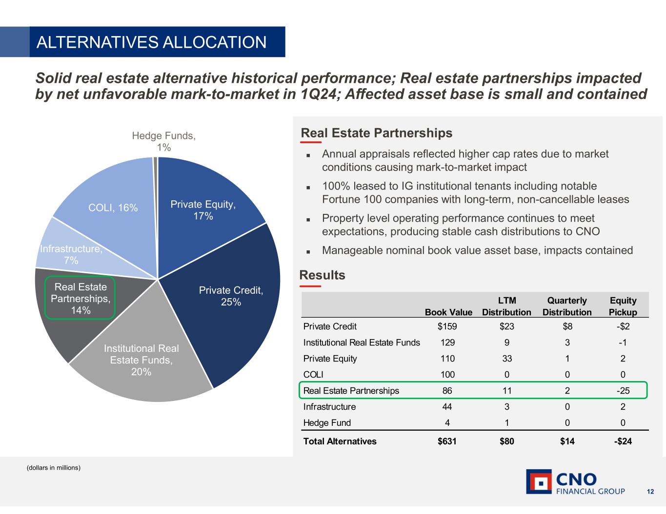 12 Private Equity, 17% Private Credit, 25% Institutional Real Estate Funds, 20% Real Estate Partnerships, 14% Infrastructure, 7% COLI, 16% Hedge Funds, 1% (dollars in millions) ALTERNATIVES ALLOCATION Book Value LTM Distribution Quarterly Distribution Equity Pickup Private Credit $159 $23 $8 -$2 Institutional Real Estate Funds 129 9 3 -1 Private Equity 110 33 1 2 COLI 100 0 0 0 Real Estate Partnerships 86 11 2 -25 Infrastructure 44 3 0 2 Hedge Fund 4 1 0 0 Total Alternatives $631 $80 $14 -$24 Solid real estate alternative historical performance; Real estate partnerships impacted by net unfavorable mark-to-market in 1Q24; Affected asset base is small and contained Results Real Estate Partnerships  Annual appraisals reflected higher cap rates due to market conditions causing mark-to-market impact  100% leased to IG institutional tenants including notable Fortune 100 companies with long-term, non-cancellable leases  Property level operating performance continues to meet expectations, producing stable cash distributions to CNO  Manageable nominal book value asset base, impacts contained