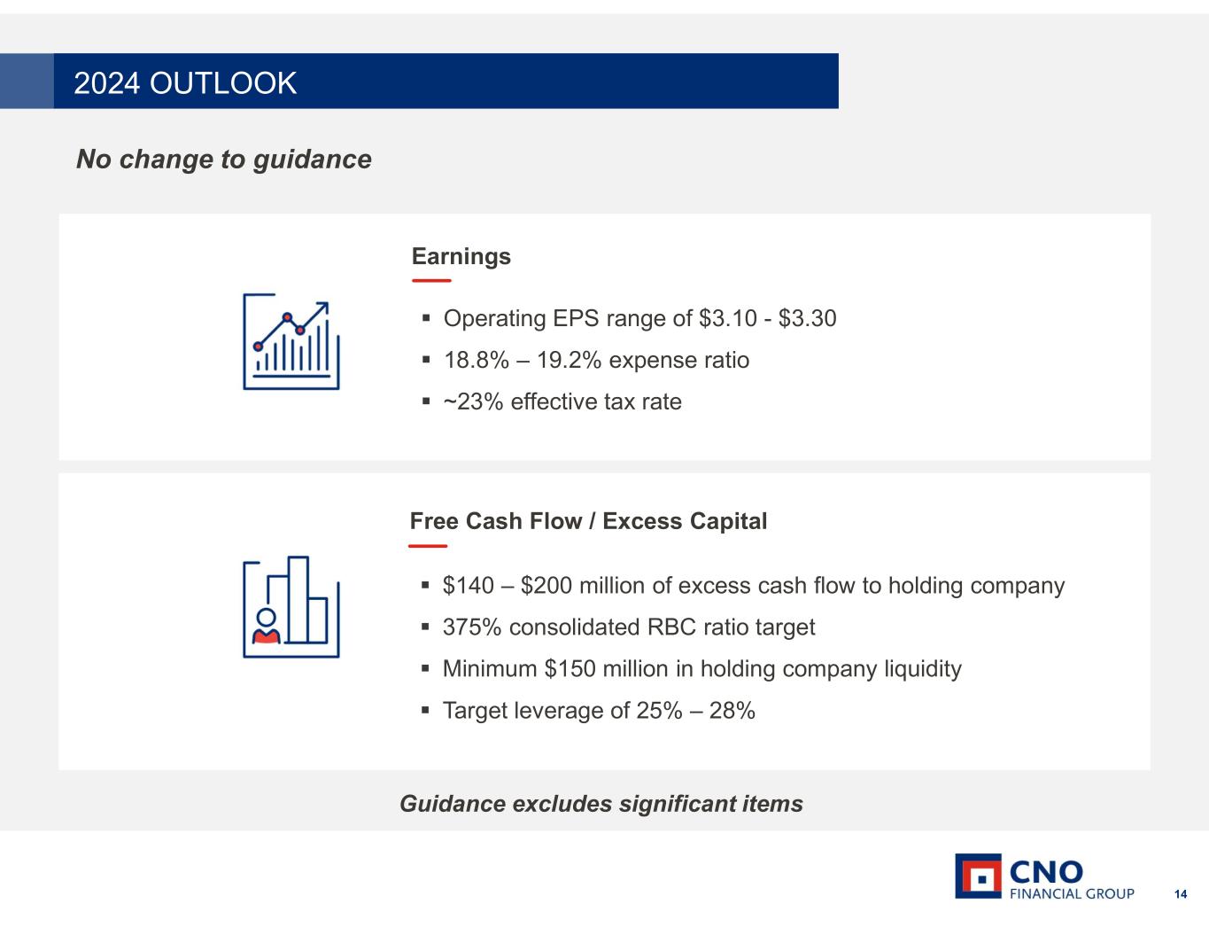 13 Debt to Capital2 Consolidated Risk Based Capital (RBC) Ratio1 Holding Company Liquidity 386% 384% 402% 391% 2021 2022 2023 1Q 2024 $249 $167 $256 $223 2021 2022 2023 1Q24 25.6% 23.4% 23.1% 22.9% 2021 2022 2023 1Q24 1 The ratio of the combined capital of the insurance companies to the minimum amount of capital appropriate to support the overall business operations, as determined based on the methodology developed by the National Association of Insurance Commissioners. 2 Excluding accumulated other comprehensive income (loss) (a non-GAAP measure). See the Appendix for a reconciliation to the corresponding GAAP measure. (dollars in millions)  Target consolidated RBC ratio of approximately 375%  RBC variability expected in periods of market volatility  Target leverage of 25 - 28%  Debt covenant ceiling of 35%  $355 million in debt capacity to top of target leverage range  Target minimum holding company liquidity of $150 million  Liquidity backstopped by $250 million undrawn revolver  No outstanding debt maturities until 2025 CAPITAL AND LIQUIDITY OVERVIEW Capital and liquidity remain above target levels
