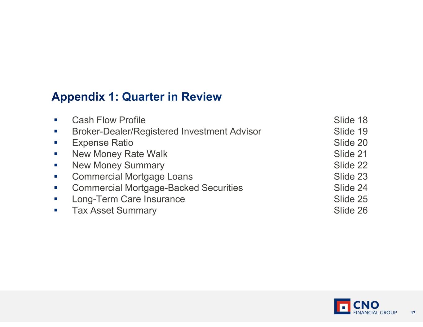 17  Cash Flow Profile Slide 18  Broker-Dealer/Registered Investment Advisor Slide 19  Expense Ratio Slide 20  New Money Rate Walk Slide 21  New Money Summary Slide 22  Commercial Mortgage Loans Slide 23  Commercial Mortgage-Backed Securities Slide 24  Long-Term Care Insurance Slide 25  Tax Asset Summary Slide 26 Appendix 1: Quarter in Review