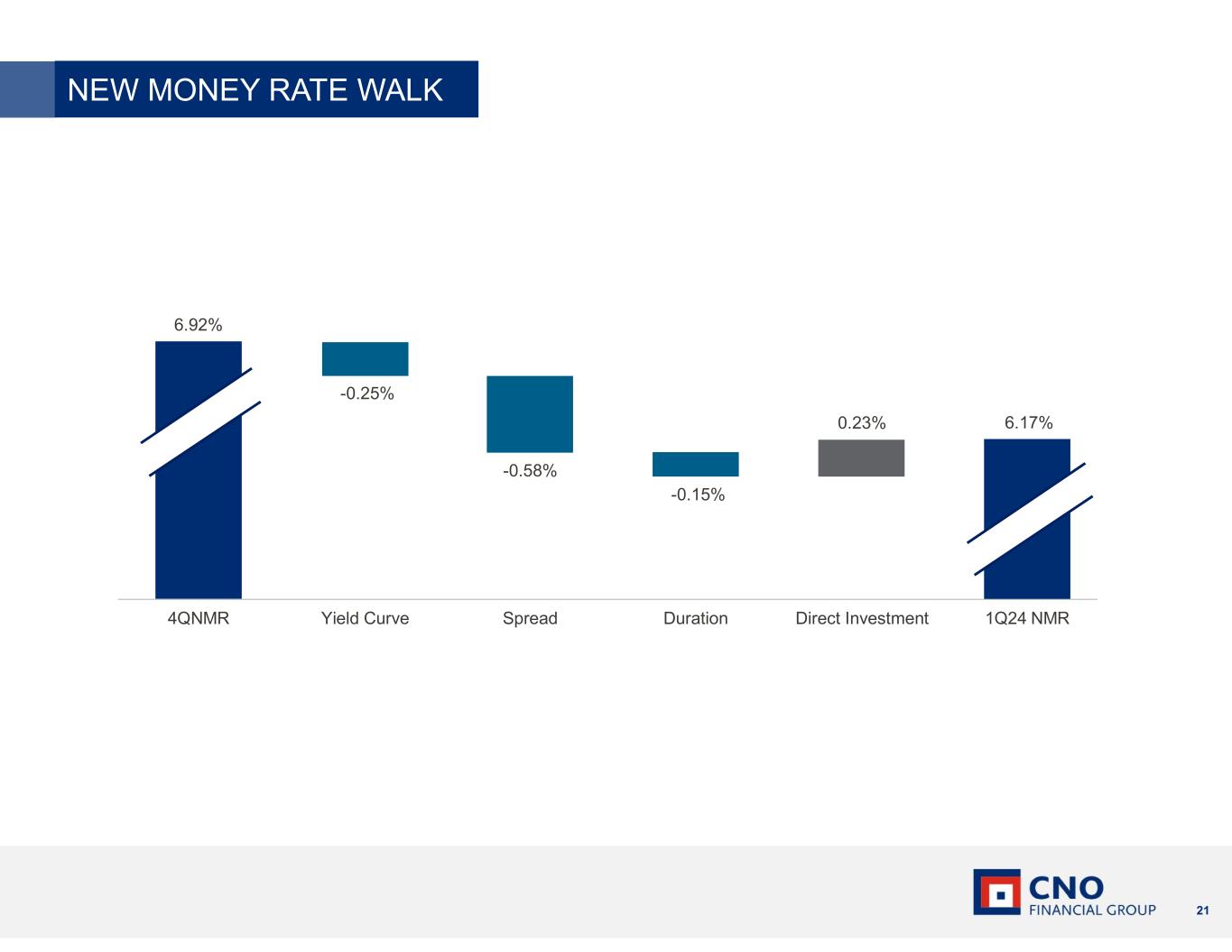 21 NEW MONEY RATE WALK 4QNMR Yield Curve Spread Duration Direct Investment 1Q24 NMR 6.92% -0.25% -0.58% -0.15% 0.23% 6.17%