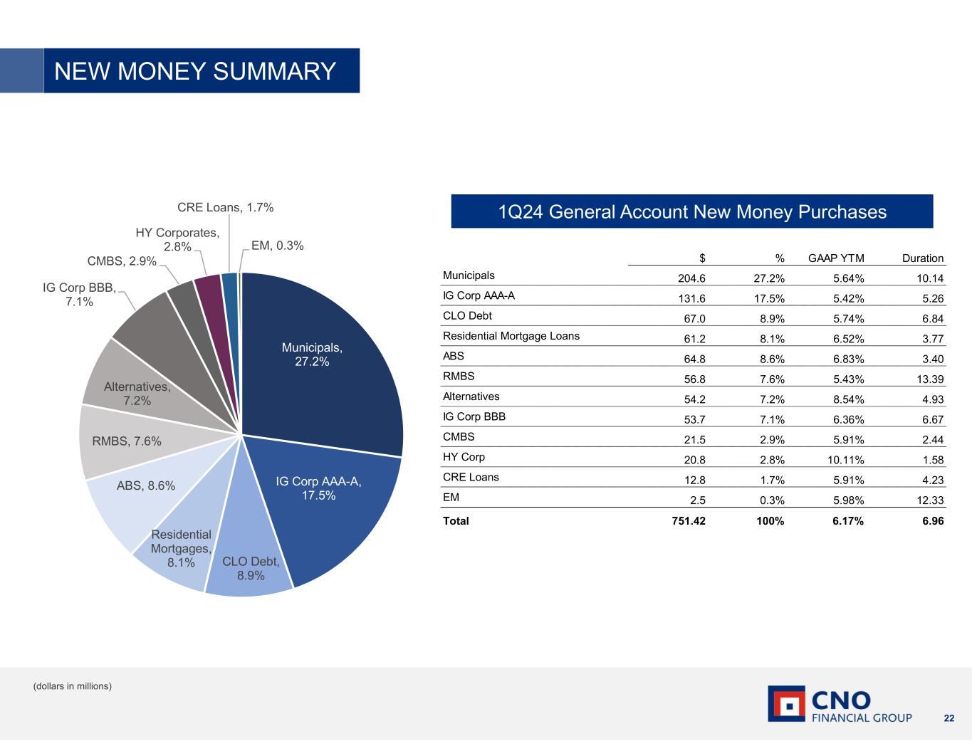 22 1Q24 General Account New Money Purchases NEW MONEY SUMMARY $ % GAAP YTM Duration Municipals 204.6 27.2% 5.64% 10.14 IG Corp AAA-A 131.6 17.5% 5.42% 5.26 CLO Debt 67.0 8.9% 5.74% 6.84 Residential Mortgage Loans 61.2 8.1% 6.52% 3.77 ABS 64.8 8.6% 6.83% 3.40 RMBS 56.8 7.6% 5.43% 13.39 Alternatives 54.2 7.2% 8.54% 4.93 IG Corp BBB 53.7 7.1% 6.36% 6.67 CMBS 21.5 2.9% 5.91% 2.44 HY Corp 20.8 2.8% 10.11% 1.58 CRE Loans 12.8 1.7% 5.91% 4.23 EM 2.5 0.3% 5.98% 12.33 Total 751.42 100% 6.17% 6.96 Municipals, 27.2% IG Corp AAA-A, 17.5% CLO Debt, 8.9% Residential Mortgages, 8.1% ABS, 8.6% RMBS, 7.6% Alternatives, 7.2% IG Corp BBB, 7.1% CMBS, 2.9% HY Corporates, 2.8% CRE Loans, 1.7% EM, 0.3% (dollars in millions)