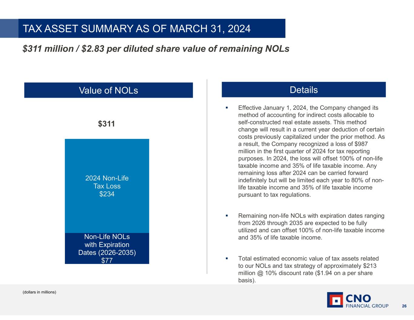 26 Value of NOLs Details  Effective January 1, 2024, the Company changed its method of accounting for indirect costs allocable to self-constructed real estate assets. This method change will result in a current year deduction of certain costs previously capitalized under the prior method. As a result, the Company recognized a loss of $987 million in the first quarter of 2024 for tax reporting purposes. In 2024, the loss will offset 100% of non-life taxable income and 35% of life taxable income. Any remaining loss after 2024 can be carried forward indefinitely but will be limited each year to 80% of non- life taxable income and 35% of life taxable income pursuant to tax regulations.  Remaining non-life NOLs with expiration dates ranging from 2026 through 2035 are expected to be fully utilized and can offset 100% of non-life taxable income and 35% of life taxable income.  Total estimated economic value of tax assets related to our NOLs and tax strategy of approximately $213 million @ 10% discount rate ($1.94 on a per share basis). $311 (dollars in millions) $311 million / $2.83 per diluted share value of remaining NOLs Non-Life NOLs with Expiration Dates (2026-2035) $77 2024 Non-Life Tax Loss $234 TAX ASSET SUMMARY AS OF MARCH 31, 2024