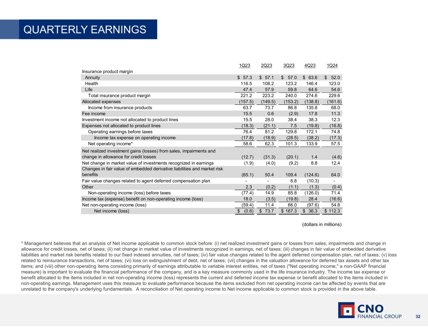 32 (dollars in millions) * Management believes that an analysis of Net income applicable to common stock before: (i) net realized investment gains or losses from sales, impairments and change in allowance for credit losses, net of taxes; (ii) net change in market value of investments recognized in earnings, net of taxes; (iii) changes in fair value of embedded derivative liabilities and market risk benefits related to our fixed indexed annuities, net of taxes; (iv) fair value changes related to the agent deferred compensation plan, net of taxes; (v) loss related to reinsurance transactions, net of taxes; (vi) loss on extinguishment of debt, net of taxes; (vii) changes in the valuation allowance for deferred tax assets and other tax items; and (viii) other non-operating items consisting primarily of earnings attributable to variable interest entities, net of taxes ("Net operating income," a non-GAAP financial measure) is important to evaluate the financial performance of the company, and is a key measure commonly used in the life insurance industry. The income tax expense or benefit allocated to the items included in net non-operating income (loss) represents the current and deferred income tax expense or benefit allocated to the items included in non-operating earnings. Management uses this measure to evaluate performance because the items excluded from net operating income can be affected by events that are unrelated to the company's underlying fundamentals. A reconciliation of Net operating income to Net income applicable to common stock is provided in the above table. 1Q23 2Q23 3Q23 4Q23 1Q24 Insurance product margin Annuity 57.3$ 57.1$ 57.0$ 63.6$ 52.0$ Health 116.5 108.2 123.2 146.4 123.0 Life 47.4 57.9 59.8 64.6 54.6 Total insurance product margin 221.2 223.2 240.0 274.6 229.6 Allocated expenses (157.5) (149.5) (153.2) (138.8) (161.6) Income from insurance products 63.7 73.7 86.8 135.8 68.0 Fee income 15.5 0.6 (2.9) 17.8 11.3 Investment income not allocated to product lines 15.5 28.0 38.4 38.3 12.3 Expenses not allocated to product lines (18.3) (21.1) 7.5 (19.8) (16.8) Operating earnings before taxes 76.4 81.2 129.8 172.1 74.8 Income tax expense on operating income (17.8) (18.9) (28.5) (38.2) (17.3) Net operating income* 58.6 62.3 101.3 133.9 57.5 Net realized investment gains (losses) from sales, impairments and change in allowance for credit losses (12.7) (31.3) (20.1) 1.4 (4.6) Net change in market value of investments recognized in earnings (1.9) (4.0) (9.2) 8.8 12.4 Changes in fair value of embedded derivative liabilities and market risk benefits (65.1) 50.4 109.4 (124.6) 64.0 Fair value changes related to agent deferred compensation plan - - 6.8 (10.3) - Other 2.3 (0.2) (1.1) (1.3) (0.4) Non-operating income (loss) before taxes (77.4) 14.9 85.8 (126.0) 71.4 Income tax (expense) benefit on non-operating income (loss) 18.0 (3.5) (19.8) 28.4 (16.6) Net non-operating income (loss) (59.4) 11.4 66.0 (97.6) 54.8 Net income (loss) (0.8)$ 73.7$ 167.3$ 36.3$ 112.3$ QUARTERLY EARNINGS