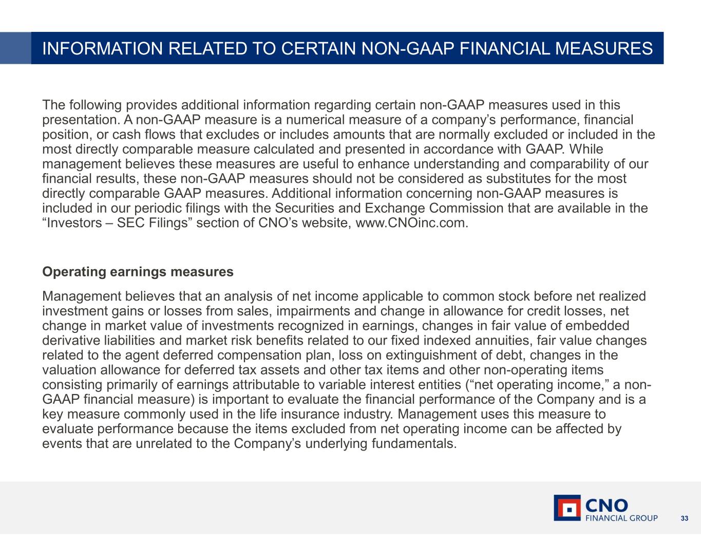 33 The following provides additional information regarding certain non-GAAP measures used in this presentation. A non-GAAP measure is a numerical measure of a company’s performance, financial position, or cash flows that excludes or includes amounts that are normally excluded or included in the most directly comparable measure calculated and presented in accordance with GAAP. While management believes these measures are useful to enhance understanding and comparability of our financial results, these non-GAAP measures should not be considered as substitutes for the most directly comparable GAAP measures. Additional information concerning non-GAAP measures is included in our periodic filings with the Securities and Exchange Commission that are available in the “Investors – SEC Filings” section of CNO’s website, www.CNOinc.com. Operating earnings measures Management believes that an analysis of net income applicable to common stock before net realized investment gains or losses from sales, impairments and change in allowance for credit losses, net change in market value of investments recognized in earnings, changes in fair value of embedded derivative liabilities and market risk benefits related to our fixed indexed annuities, fair value changes related to the agent deferred compensation plan, loss on extinguishment of debt, changes in the valuation allowance for deferred tax assets and other tax items and other non-operating items consisting primarily of earnings attributable to variable interest entities (“net operating income,” a non- GAAP financial measure) is important to evaluate the financial performance of the Company and is a key measure commonly used in the life insurance industry. Management uses this measure to evaluate performance because the items excluded from net operating income can be affected by events that are unrelated to the Company’s underlying fundamentals. INFORMATION RELATED TO CERTAIN NON-GAAP FINANCIAL MEASURES