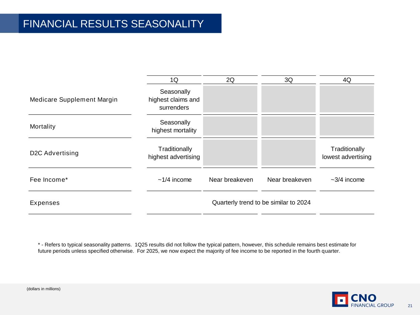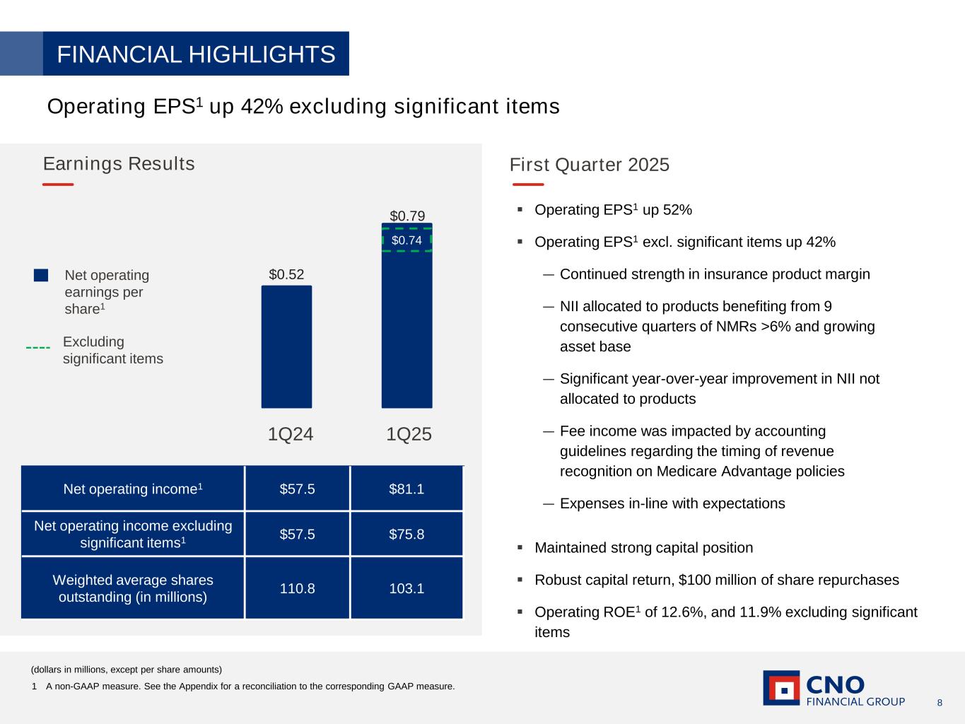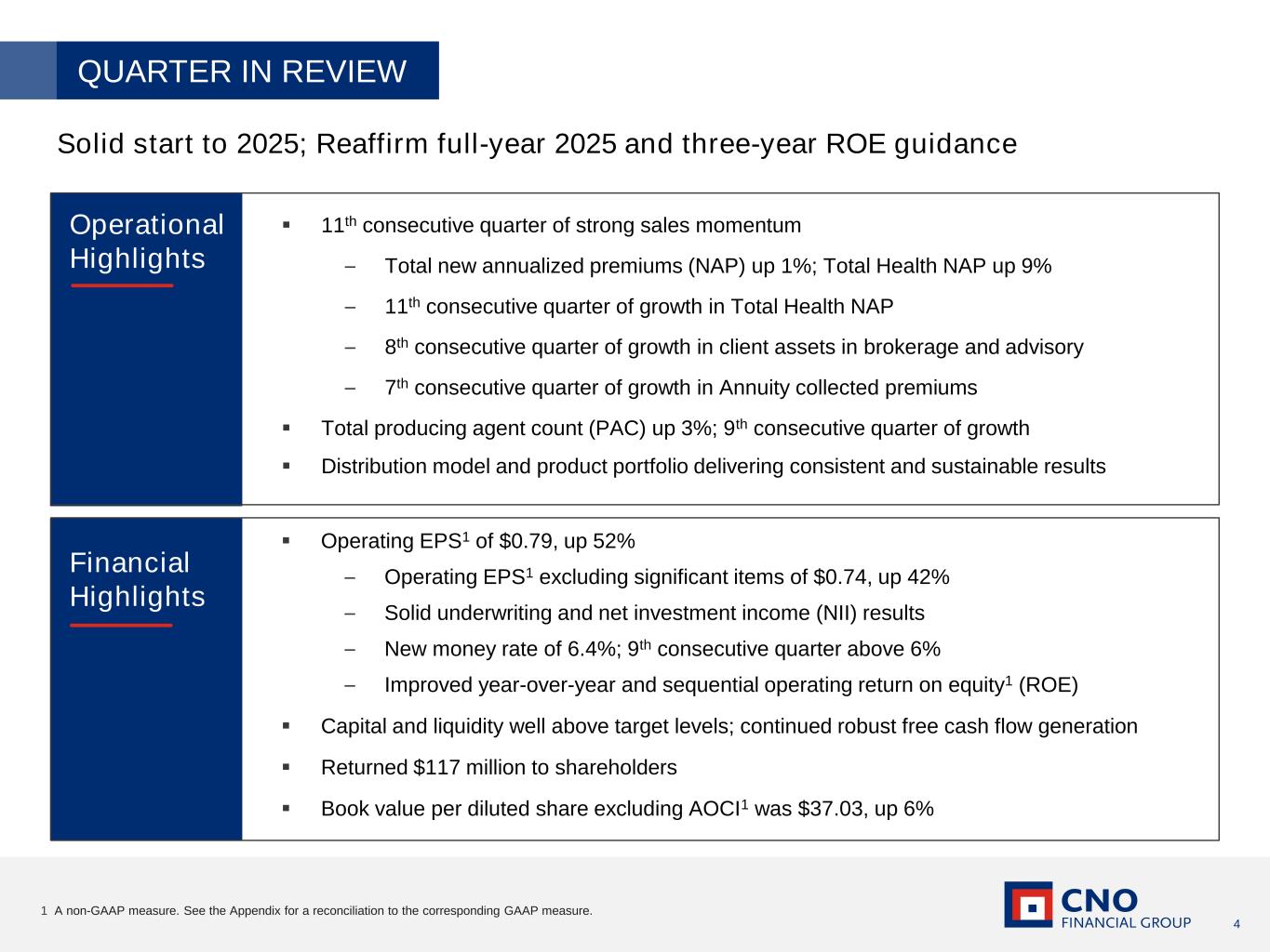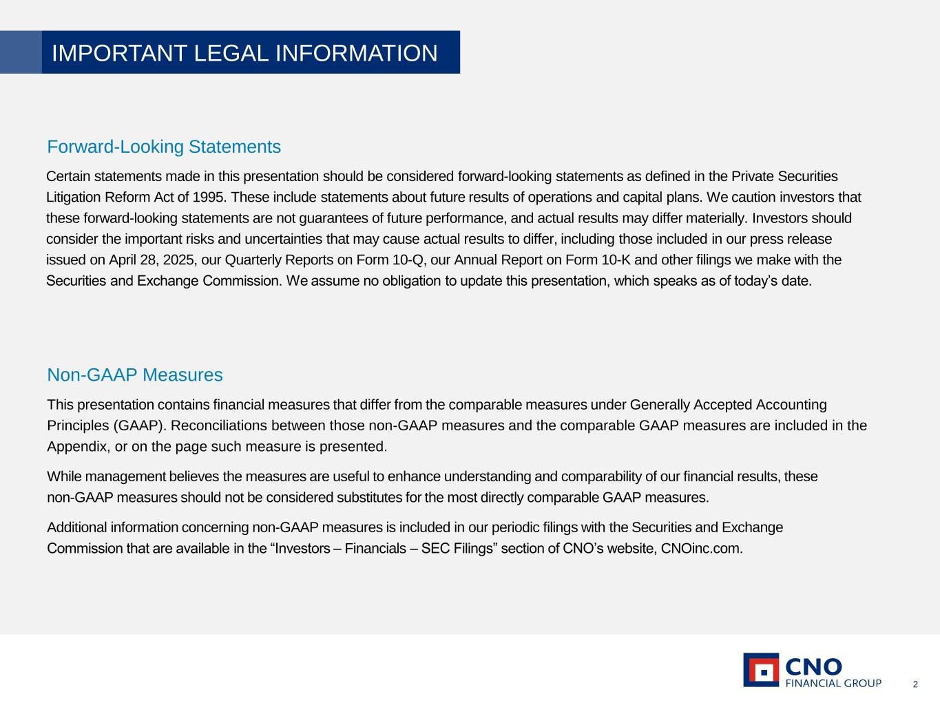2 Certain statements made in this presentation should be considered forward-looking statements as defined in the Private Securities Litigation Reform Act of 1995. These include statements about future results of operations and capital plans. We caution investors that these forward-looking statements are not guarantees of future performance, and actual results may differ materially. Investors should consider the important risks and uncertainties that may cause actual results to differ, including those included in our press release issued on April 28, 2025, our Quarterly Reports on Form 10-Q, our Annual Report on Form 10-K and other filings we make with the Securities and Exchange Commission. We assume no obligation to update this presentation, which speaks as of today’s date. Forward-Looking Statements This presentation contains financial measures that differ from the comparable measures under Generally Accepted Accounting Principles (GAAP). Reconciliations between those non-GAAP measures and the comparable GAAP measures are included in the Appendix, or on the page such measure is presented. While management believes the measures are useful to enhance understanding and comparability of our financial results, these non-GAAP measures should not be considered substitutes for the most directly comparable GAAP measures. Additional information concerning non-GAAP measures is included in our periodic filings with the Securities and Exchange Commission that are available in the “Investors – Financials – SEC Filings” section of CNO’s website, CNOinc.com. Non-GAAP Measures IMPORTANT LEGAL INFORMATION