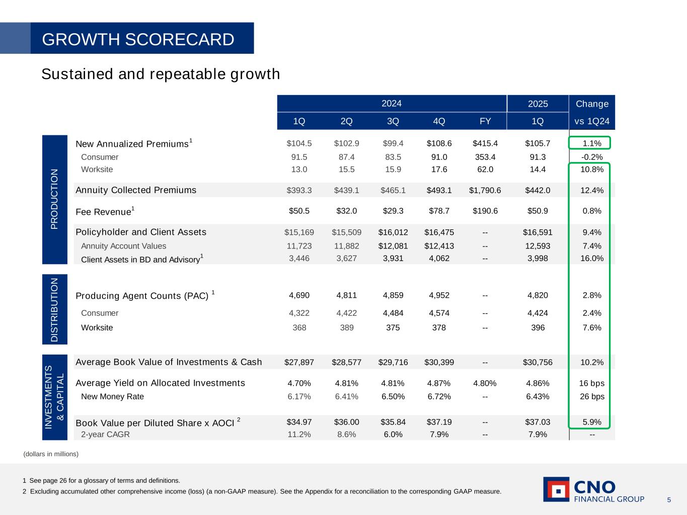 4 1 A non-GAAP measure. See the Appendix for a reconciliation to the corresponding GAAP measure. Operational Highlights Financial Highlights QUARTER IN REVIEW Solid start to 2025; Reaffirm full-year 2025 and three-year ROE guidance ▪ Operating EPS1 of $0.79, up 52% – Operating EPS1 excluding significant items of $0.74, up 42% – Solid underwriting and net investment income (NII) results – New money rate of 6.4%; 9th consecutive quarter above 6% – Improved year-over-year and sequential operating return on equity1 (ROE) ▪ Capital and liquidity well above target levels; continued robust free cash flow generation ▪ Returned $117 million to shareholders ▪ Book value per diluted share excluding AOCI1 was $37.03, up 6% ▪ 11th consecutive quarter of strong sales momentum – Total new annualized premiums (NAP) up 1%; Total Health NAP up 9% – 11th consecutive quarter of growth in Total Health NAP – 8th consecutive quarter of growth in client assets in brokerage and advisory – 7th consecutive quarter of growth in Annuity collected premiums ▪ Total producing agent count (PAC) up 3%; 9th consecutive quarter of growth ▪ Distribution model and product portfolio delivering consistent and sustainable results