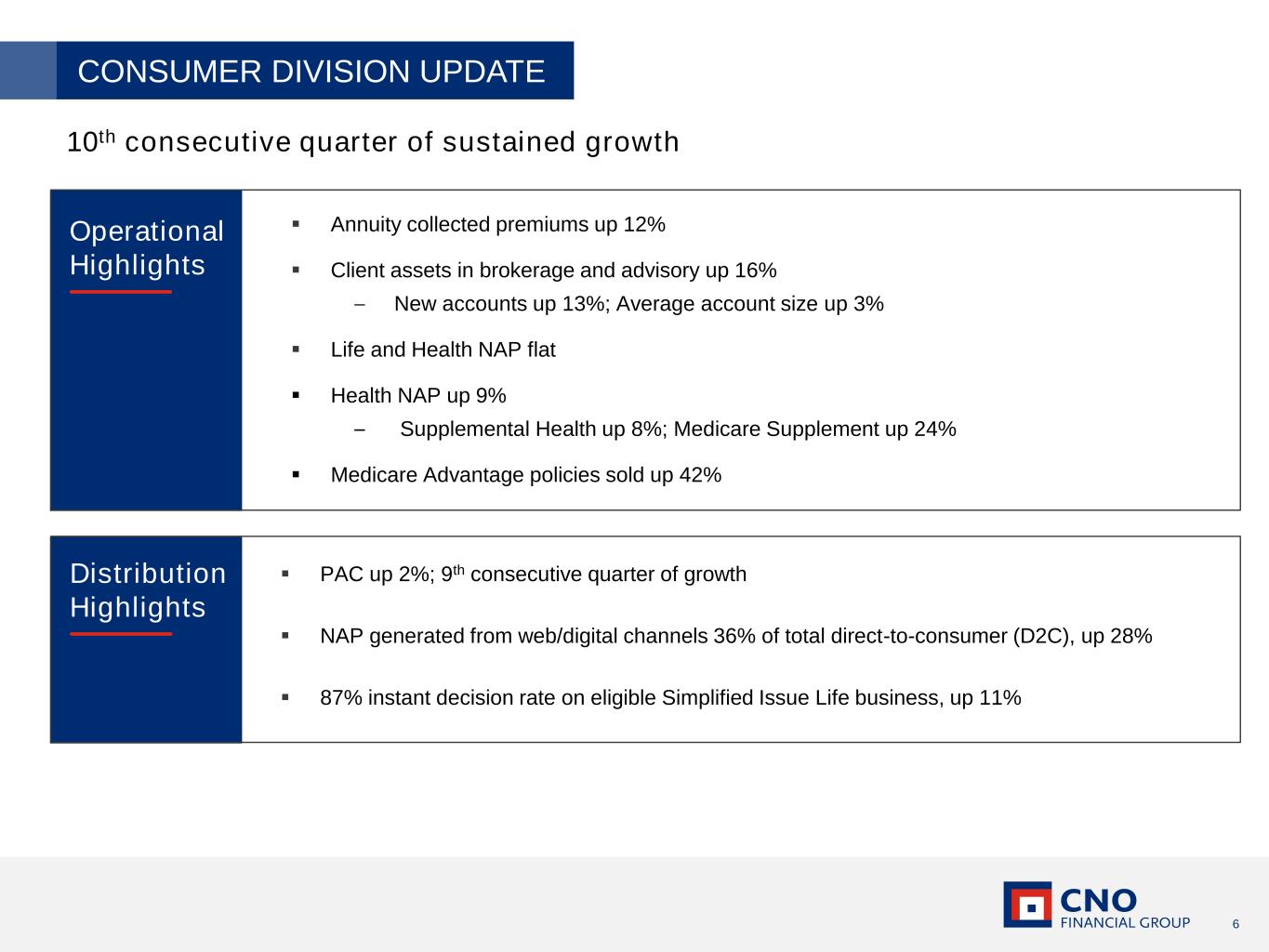 5 GROWTH SCORECARD Sustained and repeatable growth (dollars in millions) 2025 Change 1Q 2Q 3Q 4Q FY 1Q vs 1Q24 New Annualized Premiums 1 $104.5 $102.9 $99.4 $108.6 $415.4 $105.7 1.1% Consumer 91.5 87.4 83.5 91.0 353.4 91.3 -0.2% Worksite 13.0 15.5 15.9 17.6 62.0 14.4 10.8% Annuity Collected Premiums $393.3 $439.1 $465.1 $493.1 $1,790.6 $442.0 12.4% Fee Revenue 1 $50.5 $32.0 $29.3 $78.7 $190.6 $50.9 0.8% Policyholder and Client Assets $15,169 $15,509 $16,012 $16,475 -- $16,591 9.4% Annuity Account Values 11,723 11,882 $12,081 $12,413 -- 12,593 7.4% Client Assets in BD and Advisory 1 3,446 3,627 3,931 4,062 -- 3,998 16.0% Producing Agent Counts (PAC) 1 4,690 4,811 4,859 4,952 -- 4,820 2.8% Consumer 4,322 4,422 4,484 4,574 -- 4,424 2.4% Worksite 368 389 375 378 -- 396 7.6% Average Book Value of Investments & Cash $27,897 $28,577 $29,716 $30,399 -- $30,756 10.2% Average Yield on Allocated Investments 4.70% 4.81% 4.81% 4.87% 4.80% 4.86% 16 bps New Money Rate 6.17% 6.41% 6.50% 6.72% -- 6.43% 26 bps Book Value per Diluted Share x AOCI 2 $34.97 $36.00 $35.84 $37.19 -- $37.03 5.9% 2-year CAGR 11.2% 8.6% 6.0% 7.9% -- 7.9% -- 2024 IN V E S T M E N T S & C A P IT A L P R O D U C T IO N D IS T R IB U T IO N 1 See page 26 for a glossary of terms and definitions. 2 Excluding accumulated other comprehensive income (loss) (a non-GAAP measure). See the Appendix for a reconciliation to the corresponding GAAP measure.