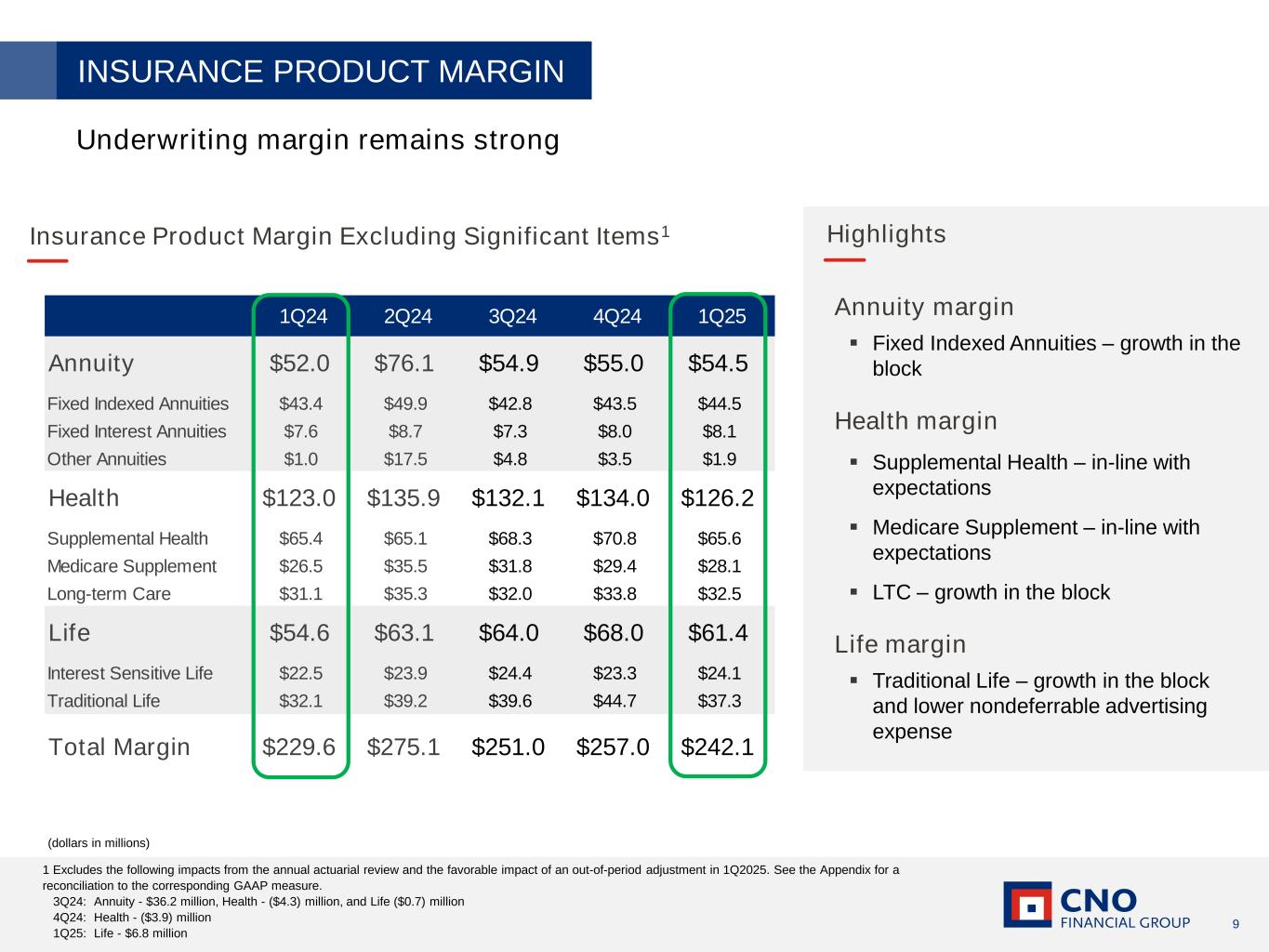8 1 A non-GAAP measure. See the Appendix for a reconciliation to the corresponding GAAP measure. Net operating income1 $57.5 $81.1 Net operating income excluding significant items1 $57.5 $75.8 Weighted average shares outstanding (in millions) 110.8 103.1 Net operating earnings per share1 First Quarter 2025 (dollars in millions, except per share amounts) Earnings Results FINANCIAL HIGHLIGHTS Operating EPS1 up 42% excluding significant items ▪ Operating EPS1 up 52% ▪ Operating EPS1 excl. significant items up 42% — Continued strength in insurance product margin — NII allocated to products benefiting from 9 consecutive quarters of NMRs >6% and growing asset base — Significant year-over-year improvement in NII not allocated to products — Fee income was impacted by accounting guidelines regarding the timing of revenue recognition on Medicare Advantage policies — Expenses in-line with expectations ▪ Maintained strong capital position ▪ Robust capital return, $100 million of share repurchases ▪ Operating ROE1 of 12.6%, and 11.9% excluding significant items $0.52 $0.79 1Q24 1Q25 Excluding significant items $0.74