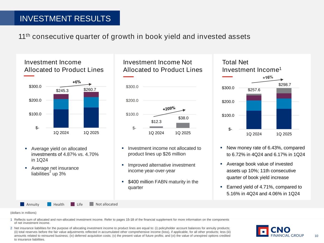 9 (dollars in millions) Insurance Product Margin Excluding Significant Items1 1 Excludes the following impacts from the annual actuarial review and the favorable impact of an out-of-period adjustment in 1Q2025. See the Appendix for a reconciliation to the corresponding GAAP measure. 3Q24: Annuity - $36.2 million, Health - ($4.3) million, and Life ($0.7) million 4Q24: Health - ($3.9) million 1Q25: Life - $6.8 million Annuity margin ▪ Fixed Indexed Annuities – growth in the block Health margin ▪ Supplemental Health – in-line with expectations ▪ Medicare Supplement – in-line with expectations ▪ LTC – growth in the block Life margin ▪ Traditional Life – growth in the block and lower nondeferrable advertising expense Highlights INSURANCE PRODUCT MARGIN Underwriting margin remains strong 1Q24 2Q24 3Q24 4Q24 1Q25 Annuity $52.0 $76.1 $54.9 $55.0 $54.5 Fixed Indexed Annuities $43.4 $49.9 $42.8 $43.5 $44.5 Fixed Interest Annuities $7.6 $8.7 $7.3 $8.0 $8.1 Other Annuities $1.0 $17.5 $4.8 $3.5 $1.9 Health $123.0 $135.9 $132.1 $134.0 $126.2 Supplemental Health $65.4 $65.1 $68.3 $70.8 $65.6 Medicare Supplement $26.5 $35.5 $31.8 $29.4 $28.1 Long-term Care $31.1 $35.3 $32.0 $33.8 $32.5 Life $54.6 $63.1 $64.0 $68.0 $61.4 Interest Sensitive Life $22.5 $23.9 $24.4 $23.3 $24.1 Traditional Life $32.1 $39.2 $39.6 $44.7 $37.3 Total Margin $229.6 $275.1 $251.0 $257.0 $242.1