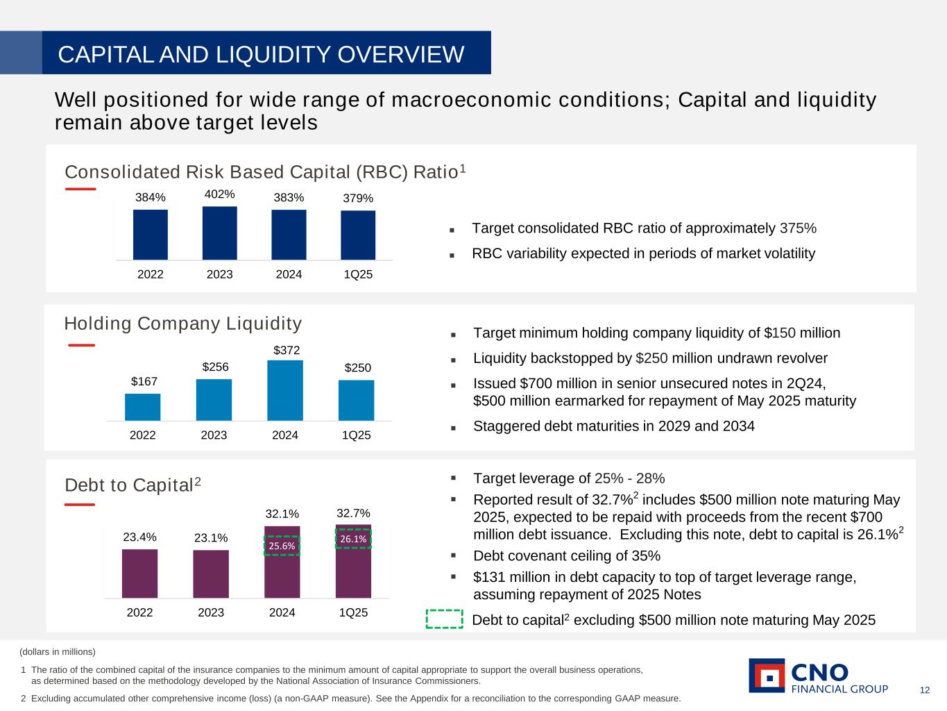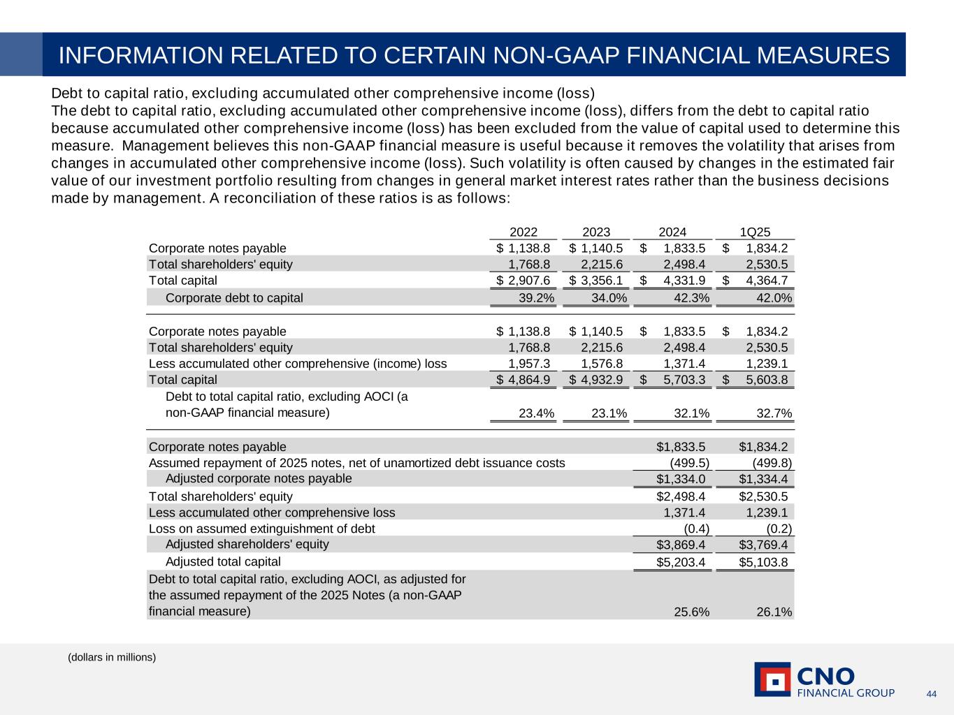 44 Debt to capital ratio, excluding accumulated other comprehensive income (loss) The debt to capital ratio, excluding accumulated other comprehensive income (loss), differs from the debt to capital ratio because accumulated other comprehensive income (loss) has been excluded from the value of capital used to determine this measure. Management believes this non-GAAP financial measure is useful because it removes the volatility that arises from changes in accumulated other comprehensive income (loss). Such volatility is often caused by changes in the estimated fair value of our investment portfolio resulting from changes in general market interest rates rather than the business decisions made by management. A reconciliation of these ratios is as follows: (dollars in millions) INFORMATION RELATED TO CERTAIN NON-GAAP FINANCIAL MEASURES 2022 2023 2024 1Q25 Corporate notes payable 1,138.8$ 1,140.5$ 1,833.5$ 1,834.2$ Total shareholders' equity 1,768.8 2,215.6 2,498.4 2,530.5 Total capital 2,907.6$ 3,356.1$ 4,331.9$ 4,364.7$ Corporate debt to capital 39.2% 34.0% 42.3% 42.0% Corporate notes payable 1,138.8$ 1,140.5$ 1,833.5$ 1,834.2$ Total shareholders' equity 1,768.8 2,215.6 2,498.4 2,530.5 Less accumulated other comprehensive (income) loss 1,957.3 1,576.8 1,371.4 1,239.1 Total capital 4,864.9$ 4,932.9$ 5,703.3$ 5,603.8$ Debt to total capital ratio, excluding AOCI (a non-GAAP financial measure) 23.4% 23.1% 32.1% 32.7% Corporate notes payable $1,833.5 $1,834.2 Assumed repayment of 2025 notes, net of unamortized debt issuance costs (499.5) (499.8) Adjusted corporate notes payable $1,334.0 $1,334.4 Total shareholders' equity $2,498.4 $2,530.5 Less accumulated other comprehensive loss 1,371.4 1,239.1 Loss on assumed extinguishment of debt (0.4) (0.2) Adjusted shareholders' equity $3,869.4 $3,769.4 Adjusted total capital $5,203.4 $5,103.8 Debt to total capital ratio, excluding AOCI, as adjusted for the assumed repayment of the 2025 Notes (a non-GAAP financial measure) 25.6% 26.1%