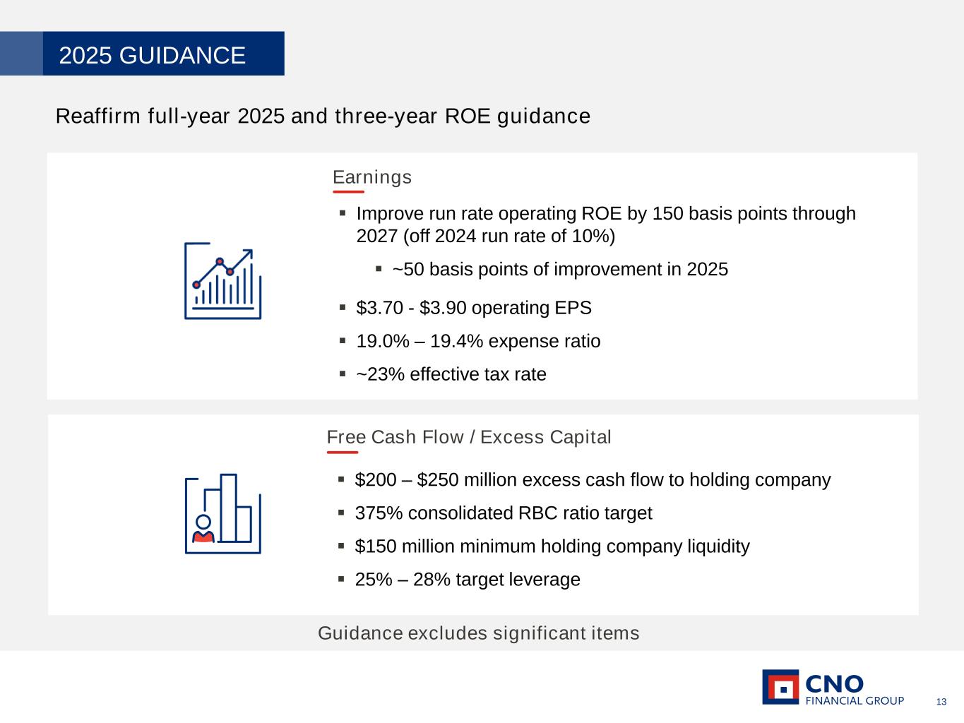 12 Debt to Capital2 Consolidated Risk Based Capital (RBC) Ratio1 Holding Company Liquidity 1 The ratio of the combined capital of the insurance companies to the minimum amount of capital appropriate to support the overall business operations, as determined based on the methodology developed by the National Association of Insurance Commissioners. 2 Excluding accumulated other comprehensive income (loss) (a non-GAAP measure). See the Appendix for a reconciliation to the corresponding GAAP measure. (dollars in millions) ◼ Target consolidated RBC ratio of approximately 375% ◼ RBC variability expected in periods of market volatility ◼ Target leverage of 25% - 28% ◼ Reported result of 32.7%2 includes $500 million note maturing May 2025, expected to be repaid with proceeds from the recent $700 million debt issuance. Excluding this note, debt to capital is 26.1%2 ◼ Debt covenant ceiling of 35% ◼ $131 million in debt capacity to top of target leverage range, assuming repayment of 2025 Notes ◼ Target minimum holding company liquidity of $150 million ◼ Liquidity backstopped by $250 million undrawn revolver ◼ Issued $700 million in senior unsecured notes in 2Q24, $500 million earmarked for repayment of May 2025 maturity ◼ Staggered debt maturities in 2029 and 2034 CAPITAL AND LIQUIDITY OVERVIEW Well positioned for wide range of macroeconomic conditions; Capital and liquidity remain above target levels 25.5% Debt to capital2 excluding $500 million note maturing May 2025 $167 $256 $372 $250 2022 2023 2024 1Q25 23.4% 23.1% 32.1% 32.7% 2022 2023 2024 1Q25 25.6% 26.1% 384% 402% 383% 379% 2022 2023 2024 1Q25