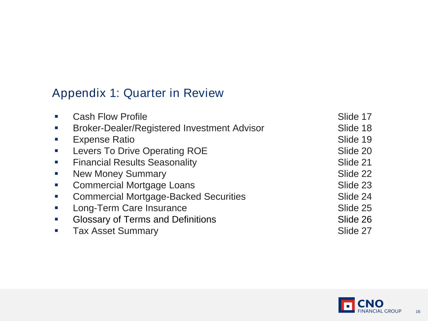 16 ▪ Cash Flow Profile Slide 17 ▪ Broker-Dealer/Registered Investment Advisor Slide 18 ▪ Expense Ratio Slide 19 ▪ Levers To Drive Operating ROE Slide 20 ▪ Financial Results Seasonality Slide 21 ▪ New Money Summary Slide 22 ▪ Commercial Mortgage Loans Slide 23 ▪ Commercial Mortgage-Backed Securities Slide 24 ▪ Long-Term Care Insurance Slide 25 ▪ Glossary of Terms and Definitions Slide 26 ▪ Tax Asset Summary Slide 27 Appendix 1: Quarter in Review