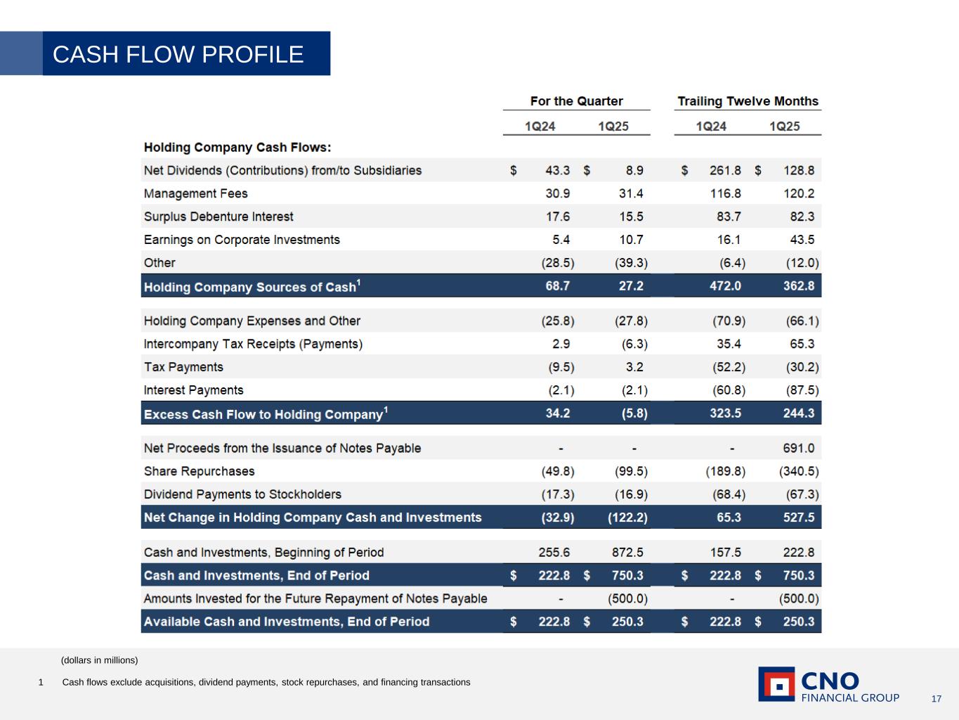 17 1 Cash flows exclude acquisitions, dividend payments, stock repurchases, and financing transactions (dollars in millions) CASH FLOW PROFILE