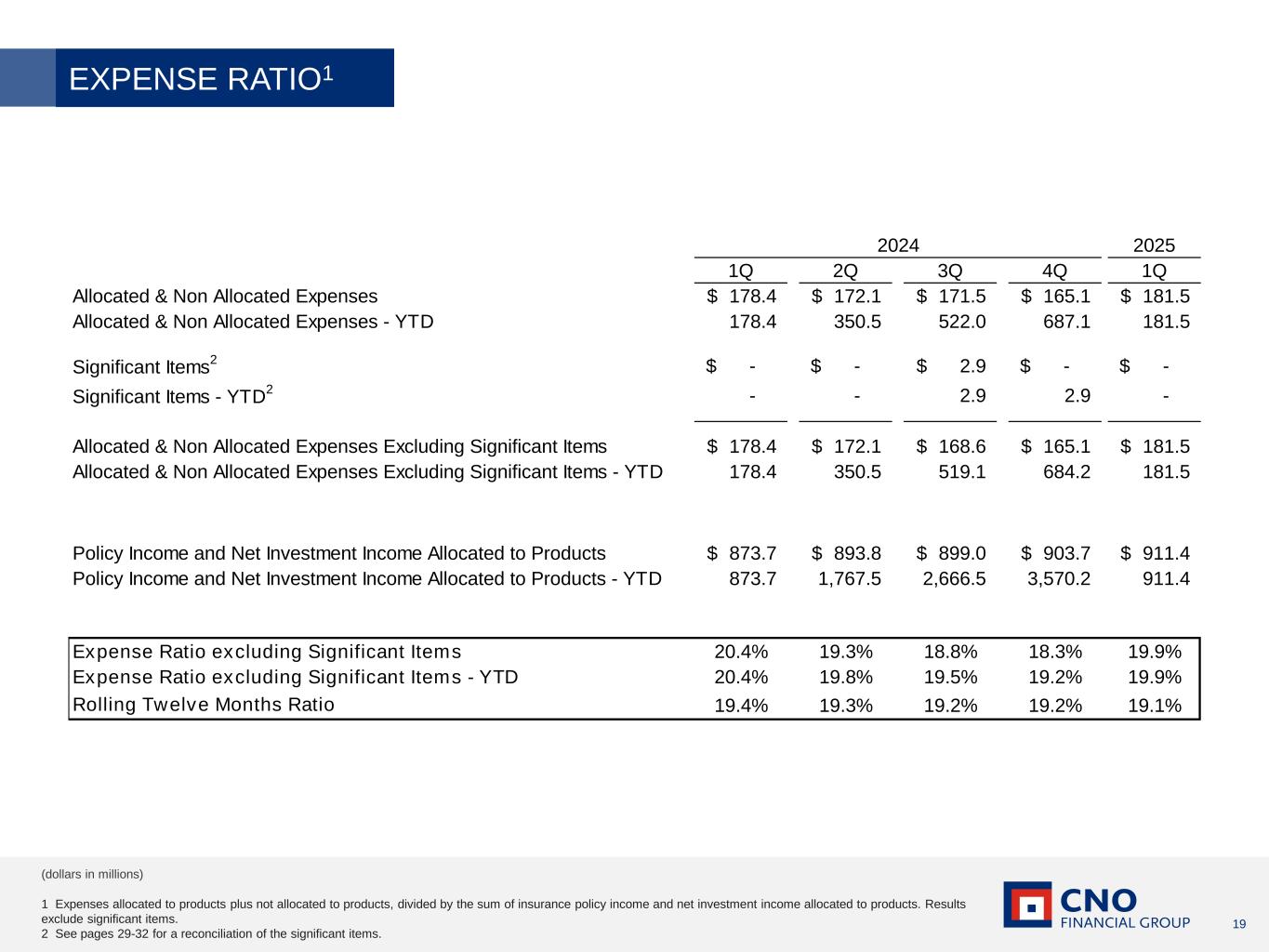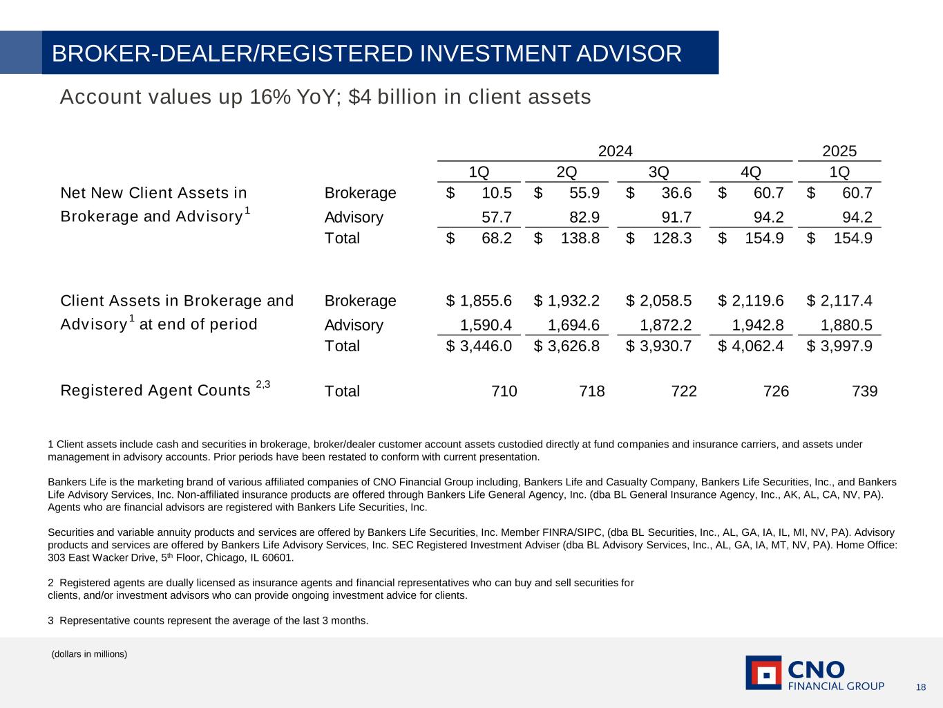 18 Account values up 16% YoY; $4 billion in client assets 1 Client assets include cash and securities in brokerage, broker/dealer customer account assets custodied directly at fund companies and insurance carriers, and assets under management in advisory accounts. Prior periods have been restated to conform with current presentation. Bankers Life is the marketing brand of various affiliated companies of CNO Financial Group including, Bankers Life and Casualty Company, Bankers Life Securities, Inc., and Bankers Life Advisory Services, Inc. Non-affiliated insurance products are offered through Bankers Life General Agency, Inc. (dba BL General Insurance Agency, Inc., AK, AL, CA, NV, PA). Agents who are financial advisors are registered with Bankers Life Securities, Inc. Securities and variable annuity products and services are offered by Bankers Life Securities, Inc. Member FINRA/SIPC, (dba BL Securities, Inc., AL, GA, IA, IL, MI, NV, PA). Advisory products and services are offered by Bankers Life Advisory Services, Inc. SEC Registered Investment Adviser (dba BL Advisory Services, Inc., AL, GA, IA, MT, NV, PA). Home Office: 303 East Wacker Drive, 5th Floor, Chicago, IL 60601. 2 Registered agents are dually licensed as insurance agents and financial representatives who can buy and sell securities for clients, and/or investment advisors who can provide ongoing investment advice for clients. 3 Representative counts represent the average of the last 3 months. (dollars in millions) BROKER-DEALER/REGISTERED INVESTMENT ADVISOR 2025 1Q 2Q 3Q 4Q 1Q Net New Client Assets in Brokerage 10.5$ 55.9$ 36.6$ 60.7$ 60.7$ Brokerage and Advisory 1 Advisory 57.7 82.9 91.7 94.2 94.2 Total 68.2$ 138.8$ 128.3$ 154.9$ 154.9$ Client Assets in Brokerage and Brokerage 1,855.6$ 1,932.2$ 2,058.5$ 2,119.6$ 2,117.4$ Advisory 1 at end of period Advisory 1,590.4 1,694.6 1,872.2 1,942.8 1,880.5 Total 3,446.0$ 3,626.8$ 3,930.7$ 4,062.4$ 3,997.9$ Registered Agent Counts 2,3 Total 710 718 722 726 739 2024