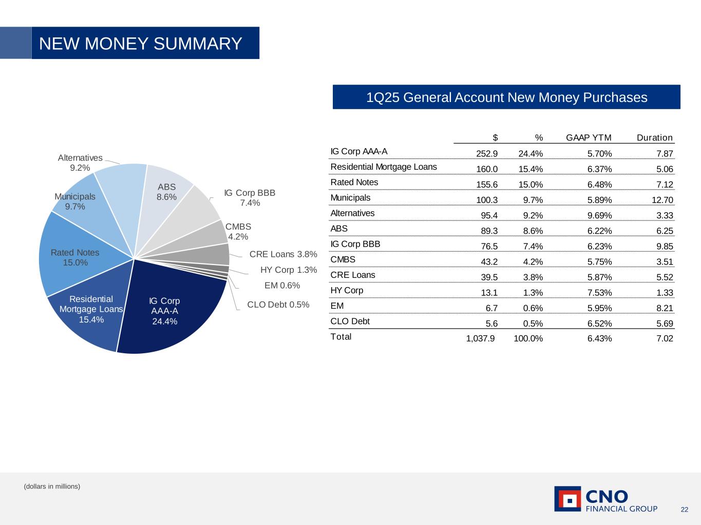 22 1Q25 General Account New Money Purchases NEW MONEY SUMMARY (dollars in millions) $ % GAAP YTM Duration IG Corp AAA-A 252.9 24.4% 5.70% 7.87 Residential Mortgage Loans 160.0 15.4% 6.37% 5.06 Rated Notes 155.6 15.0% 6.48% 7.12 Municipals 100.3 9.7% 5.89% 12.70 Alternatives 95.4 9.2% 9.69% 3.33 ABS 89.3 8.6% 6.22% 6.25 IG Corp BBB 76.5 7.4% 6.23% 9.85 CMBS 43.2 4.2% 5.75% 3.51 CRE Loans 39.5 3.8% 5.87% 5.52 HY Corp 13.1 1.3% 7.53% 1.33 EM 6.7 0.6% 5.95% 8.21 CLO Debt 5.6 0.5% 6.52% 5.69 Total 1,037.9 100.0% 6.43% 7.02 IG Corp AAA-A 24.4% Residential Mortgage Loans 15.4% Rated Notes 15.0% Municipals 9.7% Alternatives 9.2% ABS 8.6% IG Corp BBB 7.4% CMBS 4.2% CRE Loans 3.8% HY Corp 1.3% EM 0.6% CLO Debt 0.5%