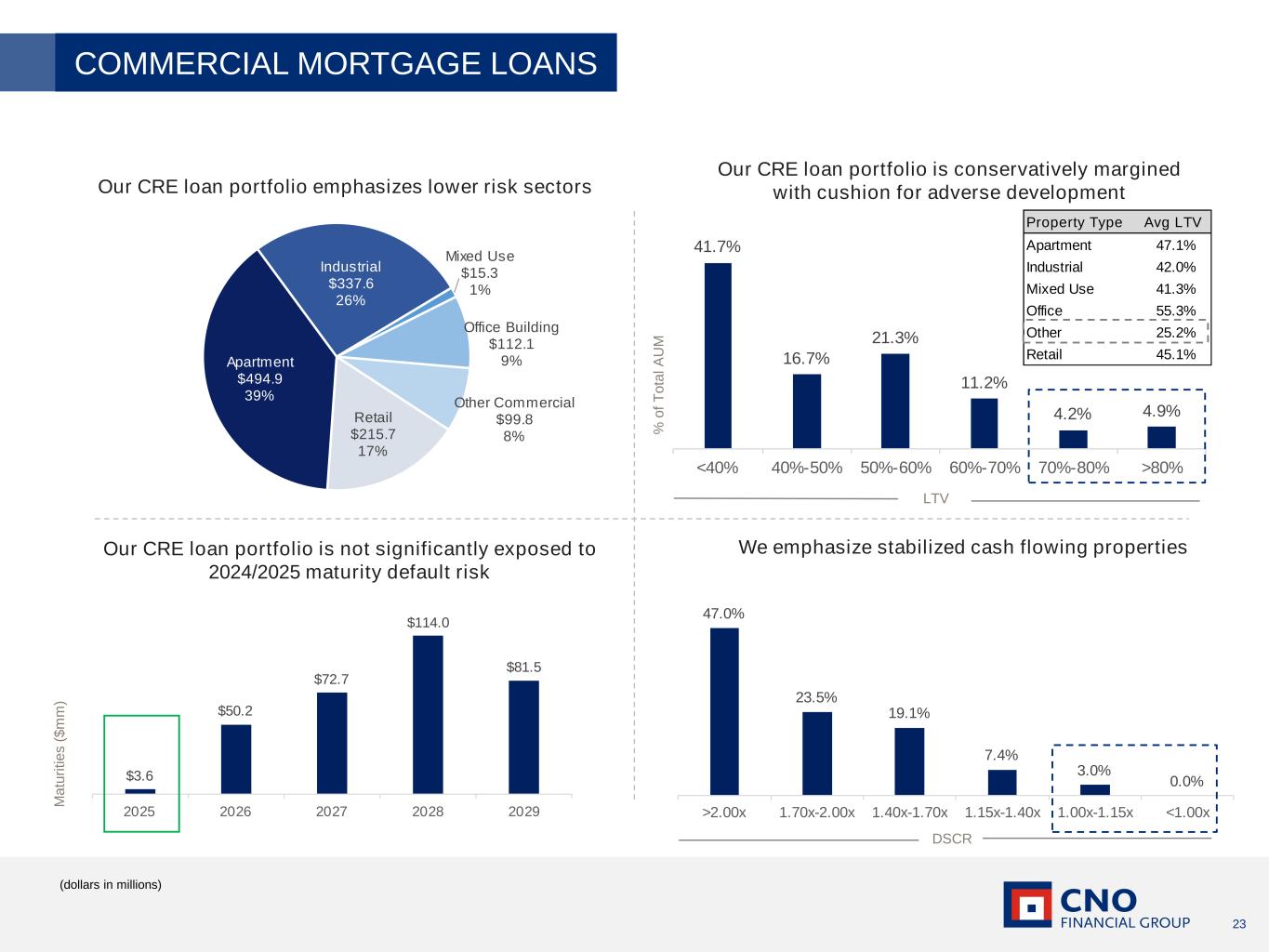 23 Our CRE loan portfolio emphasizes lower risk sectors Our CRE loan portfolio is conservatively margined with cushion for adverse development We emphasize stabilized cash flowing propertiesOur CRE loan portfolio is not significantly exposed to 2024/2025 maturity default risk (dollars in millions) COMMERCIAL MORTGAGE LOANS Apartment $494.9 39% Industrial $337.6 26% Mixed Use $15.3 1% Office Building $112.1 9% Other Commercial $99.8 8% Retail $215.7 17% 41.7% 16.7% 21.3% 11.2% 4.2% 4.9% <40% 40%-50% 50%-60% 60%-70% 70%-80% >80% LTV % o f T o ta l A U M Property Type Avg LTV Apartment 47.1% Industrial 42.0% Mixed Use 41.3% Office 55.3% Other 25.2% Retail 45.1% $3.6 $50.2 $72.7 $114.0 $81.5 2025 2026 2027 2028 2029 M a tu ri ti e s ( $ m m ) 47.0% 23.5% 19.1% 7.4% 3.0% 0.0% >2.00x 1.70x-2.00x 1.40x-1.70x 1.15x-1.40x 1.00x-1.15x <1.00x DSCR