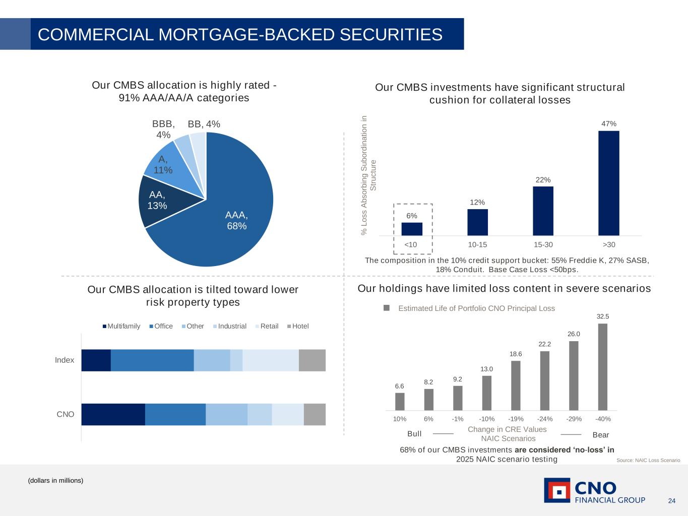 24 Source: NAIC Loss Scenario Our CMBS investments have significant structural cushion for collateral losses Our holdings have limited loss content in severe scenariosOur CMBS allocation is tilted toward lower risk property types Our CMBS allocation is highly rated - 91% AAA/AA/A categories (dollars in millions) COMMERCIAL MORTGAGE-BACKED SECURITIES AAA, 68% AA, 13% A, 11% BBB, 4% BB, 4% 6% 12% 22% 47% <10 10-15 15-30 >30 The composition in the 10% credit support bucket: 55% Freddie K, 27% SASB, 18% Conduit. Base Case Loss <50bps. % L o s s A b s o rb in g S u b o rd in a ti o n i n S tr u c tu re CNO Index Multifamily Office Other Industrial Retail Hotel 6.6 8.2 9.2 13.0 18.6 22.2 26.0 32.5 10% 6% -1% -10% -19% -24% -29% -40% Estimated Life of Portfolio CNO Principal Loss 68% of our CMBS investments are considered ‘no-loss’ in 2025 NAIC scenario testing Bull Change in CRE Values NAIC Scenarios Bear